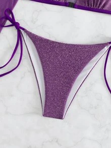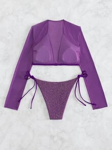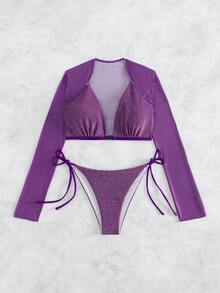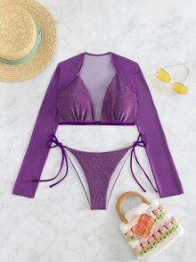 Conjunto de bikini de verano de playa con triángulo, cuello halter, manga larga y brillos