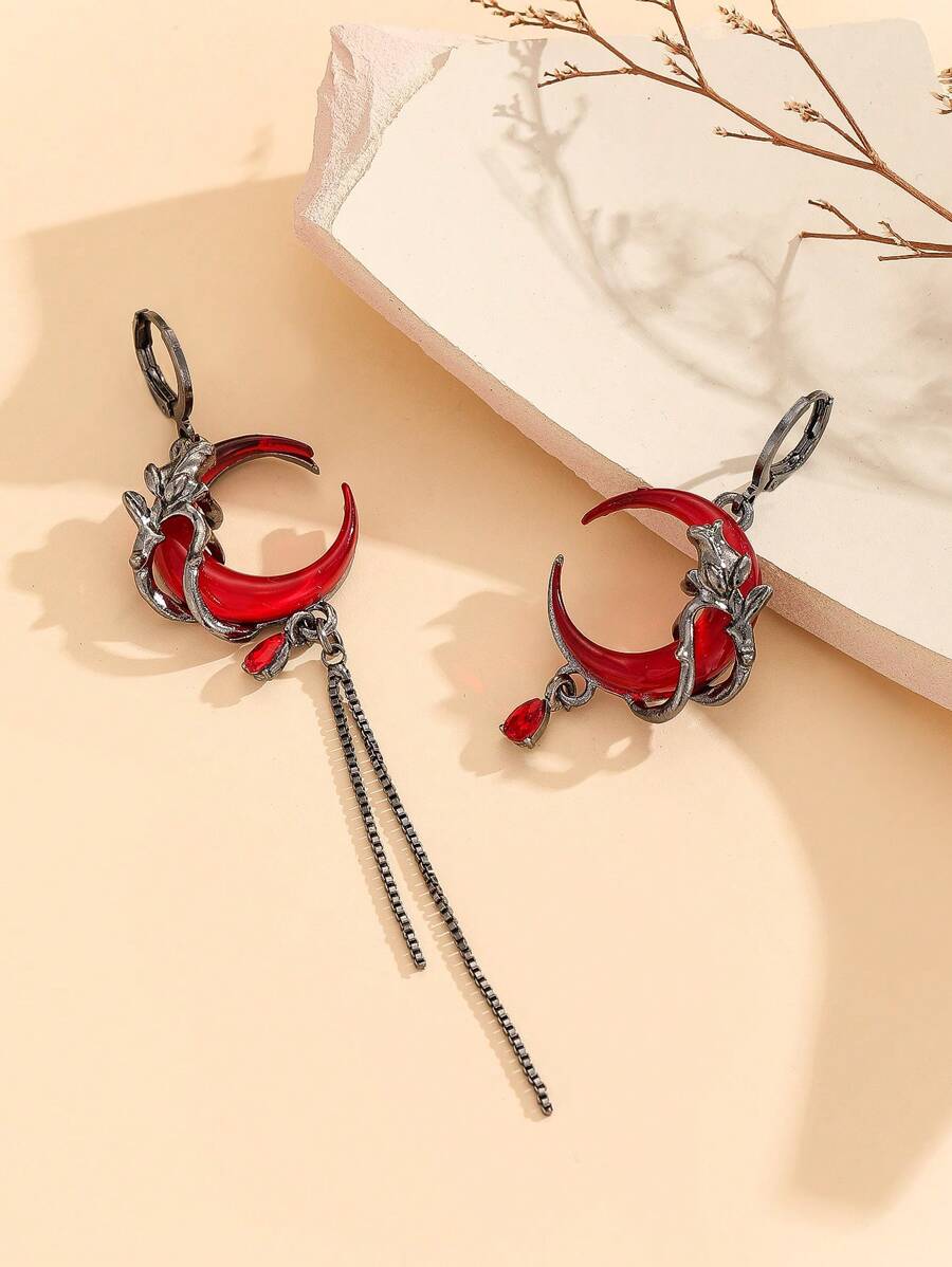 Goth 1 par de pendientes asimétricos en forma de media luna rojo oscuro, diseño vintage de moda de alta gama con flor de rosa y borla asimétrica como decoración para el oído de las mujeres