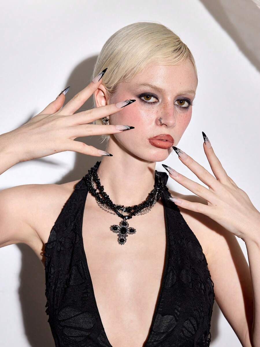 Goth 10 piezas de uñas postizas de alta calidad con elementos estampados de estrellos estilo Y2K + 3 hojas de cinta adhesiva doble cara, decoraciones con rhinestones y brillos para uñas, pegatinas reutilizables de arte de uñas adecuadas para vacaciones, fiestas, baile y uso diario