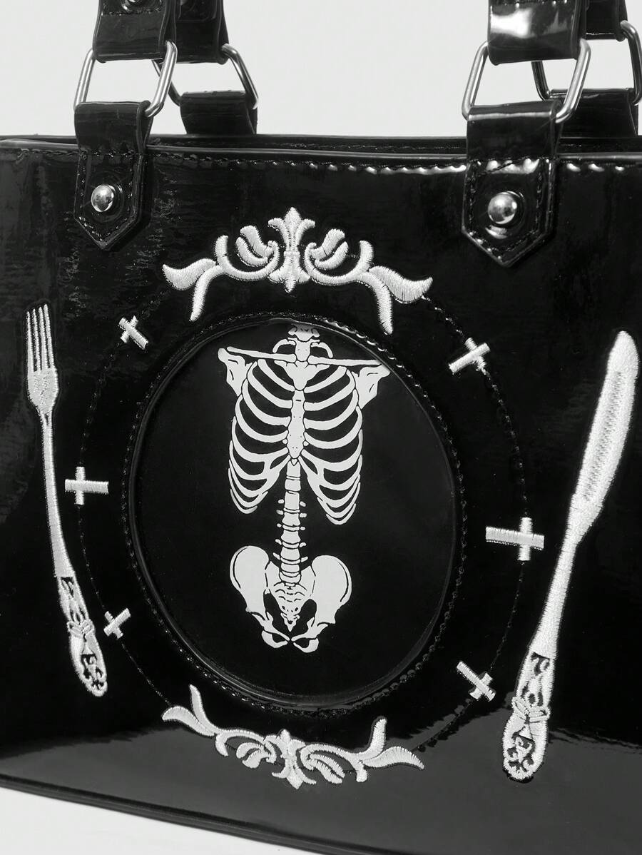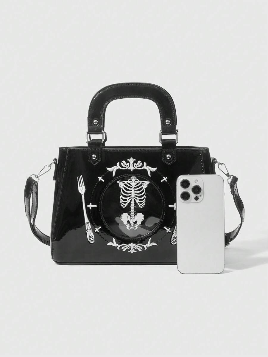 1 pieza Bolso de hombro tipo bandolera con forma de plato para cena, con bordado de calavera gótica estilo goth
