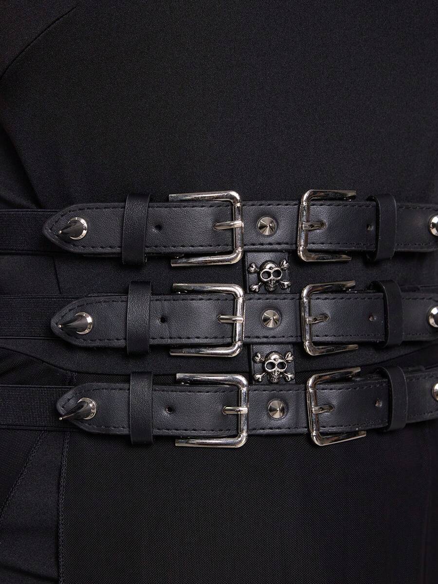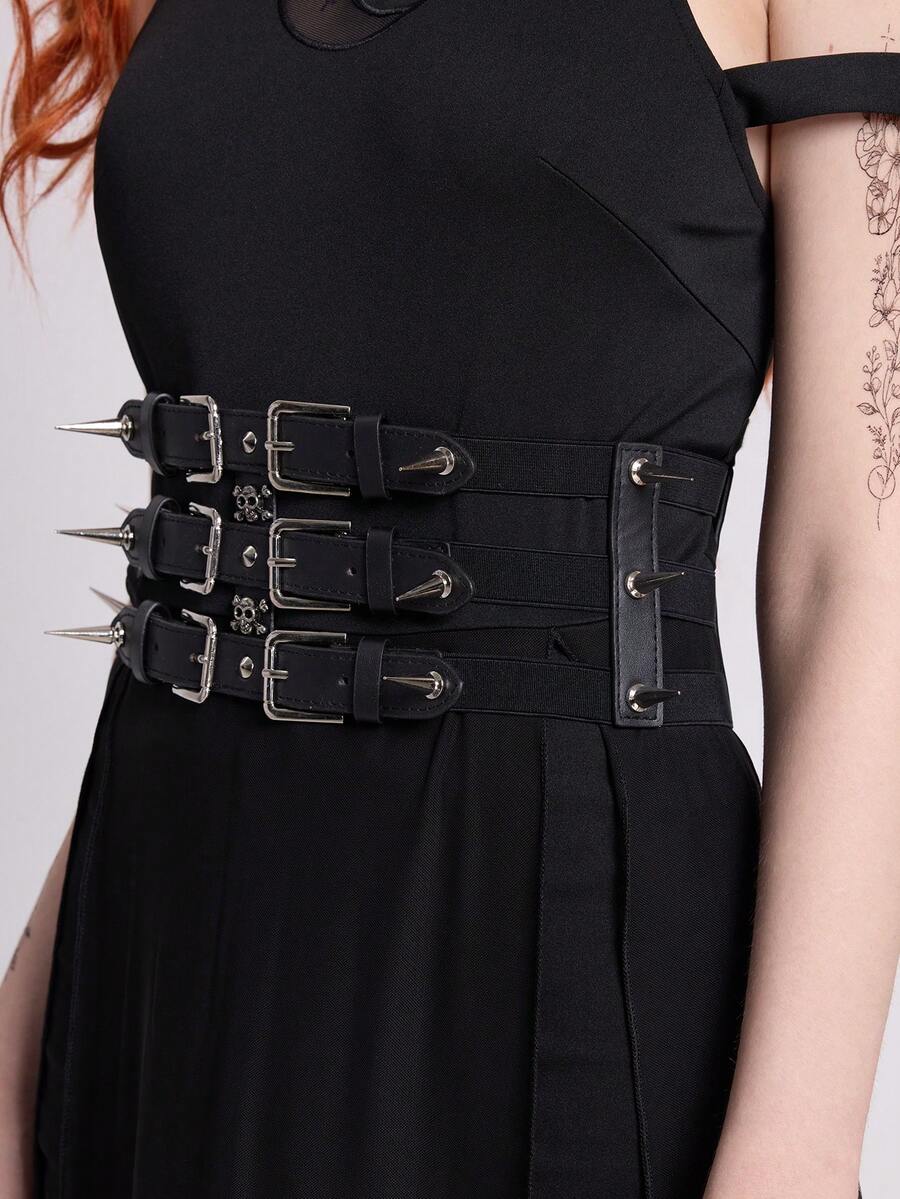 Goth 1 pieza Cinturón de mujer negro con decoración de calavera con púas, accesorio versátil para vestir en estilo punk oscuro