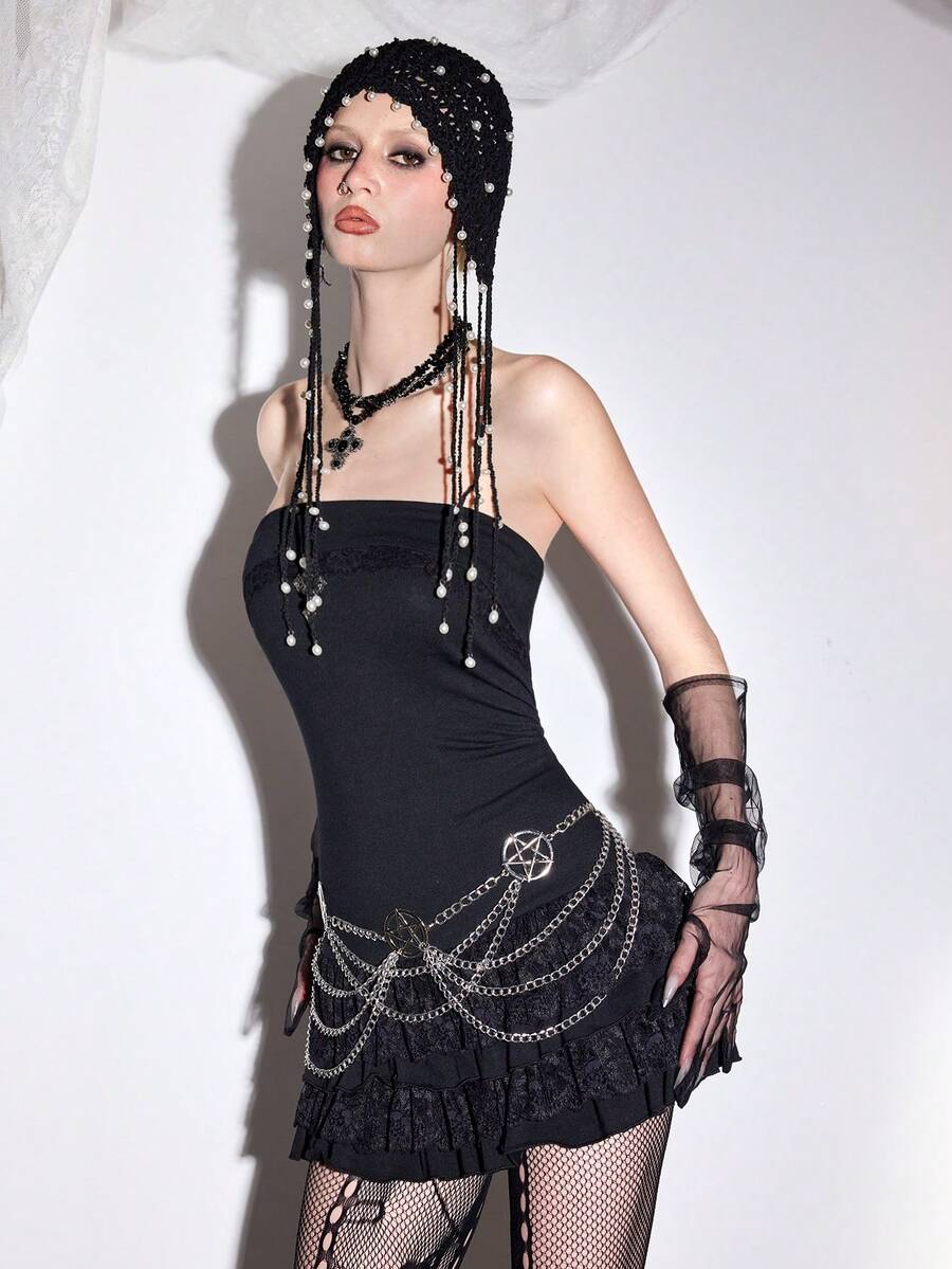 Goth 1 pieza Accesorio de decoración de cadena multicapa con decoración de estrella de cinco puntas hueca plateada de estilo punk oscuro para mujer, cadena para la cintura para vestidos, vaqueros, uso diario