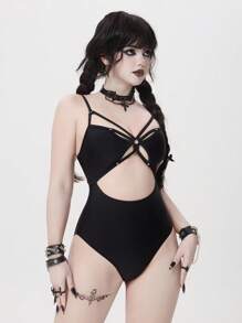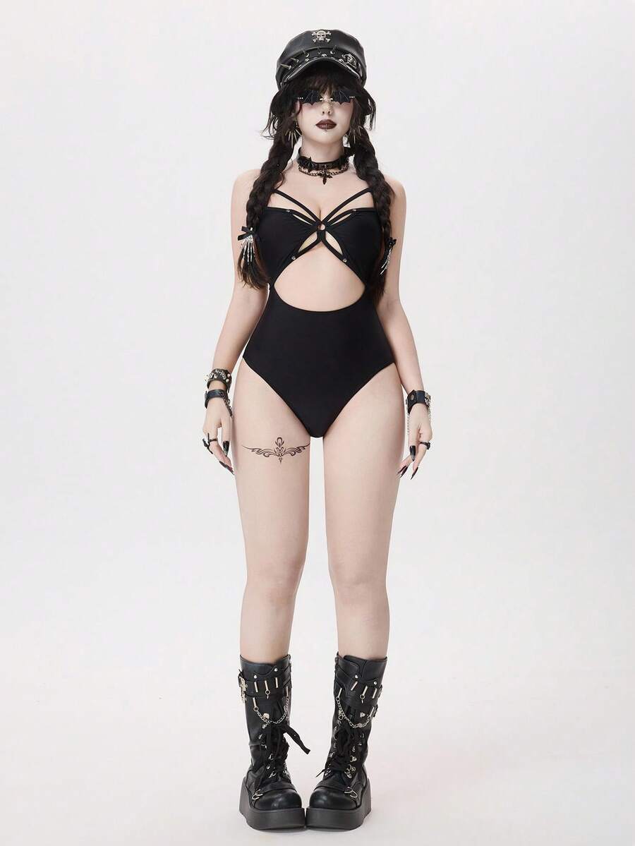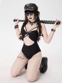 Goth 1 pieza Traje de baño de una sola pieza de unicolor y sexy con diseño calado para mujer, Halloween