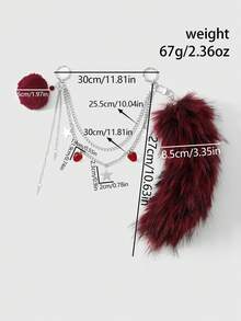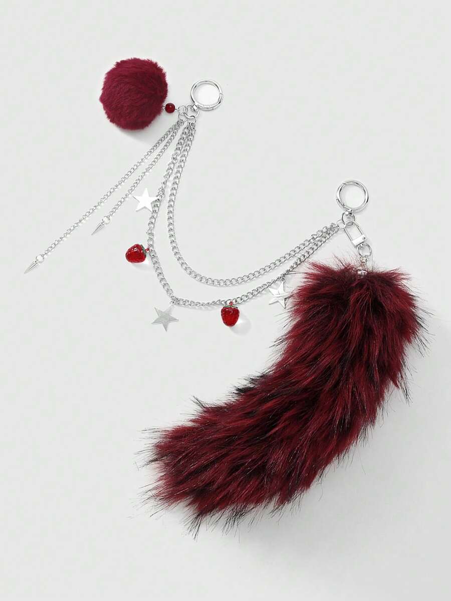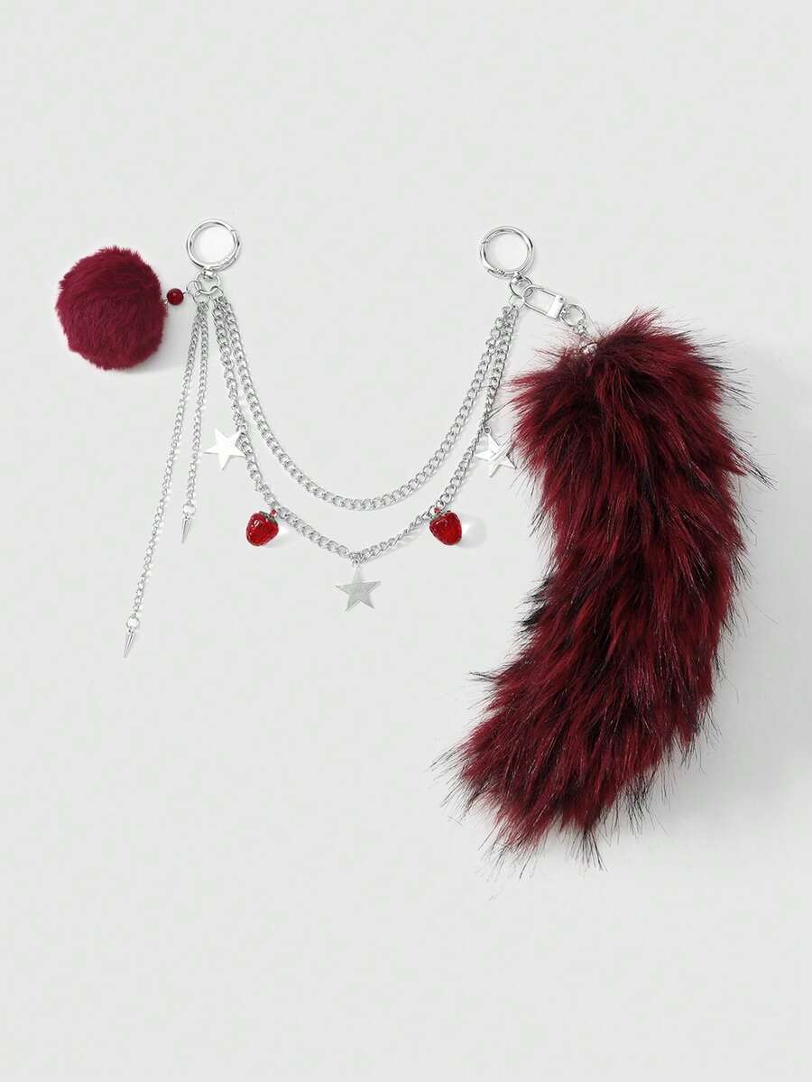Goth 1 pieza Llavero/Accesorio de mochila con cadena doble hueca de alta calidad, remache en forma de estrella, resina, fresa burdeos, peludo, degradado brillante, cola de zorro falsa, estilo Y2K punk retro, adecuado para cosplay, uso diario, regalo