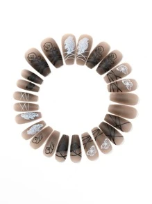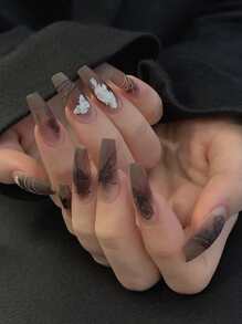 Goth 24 piezas Uña postiza largo ataúd con estampado de mariposa