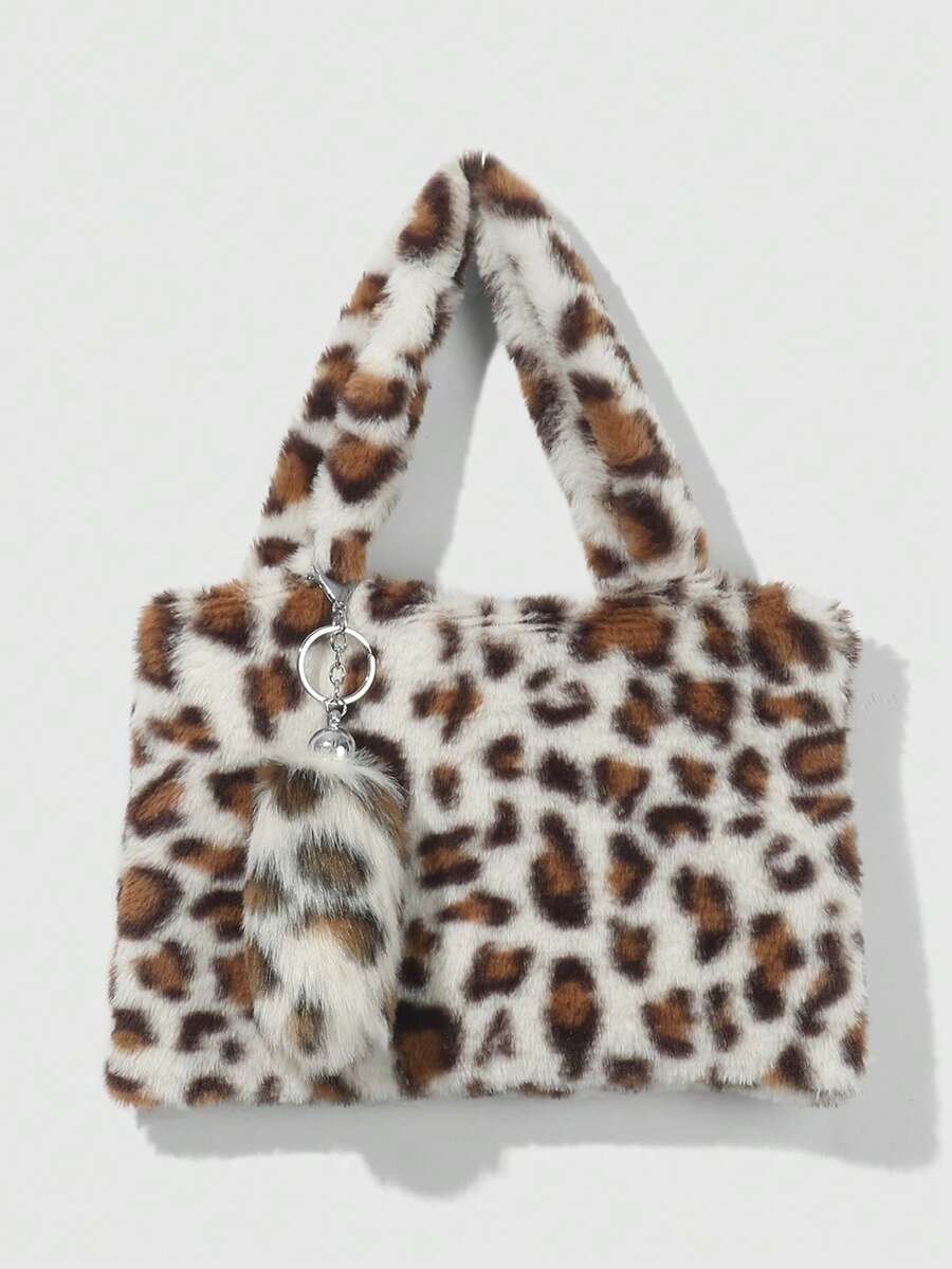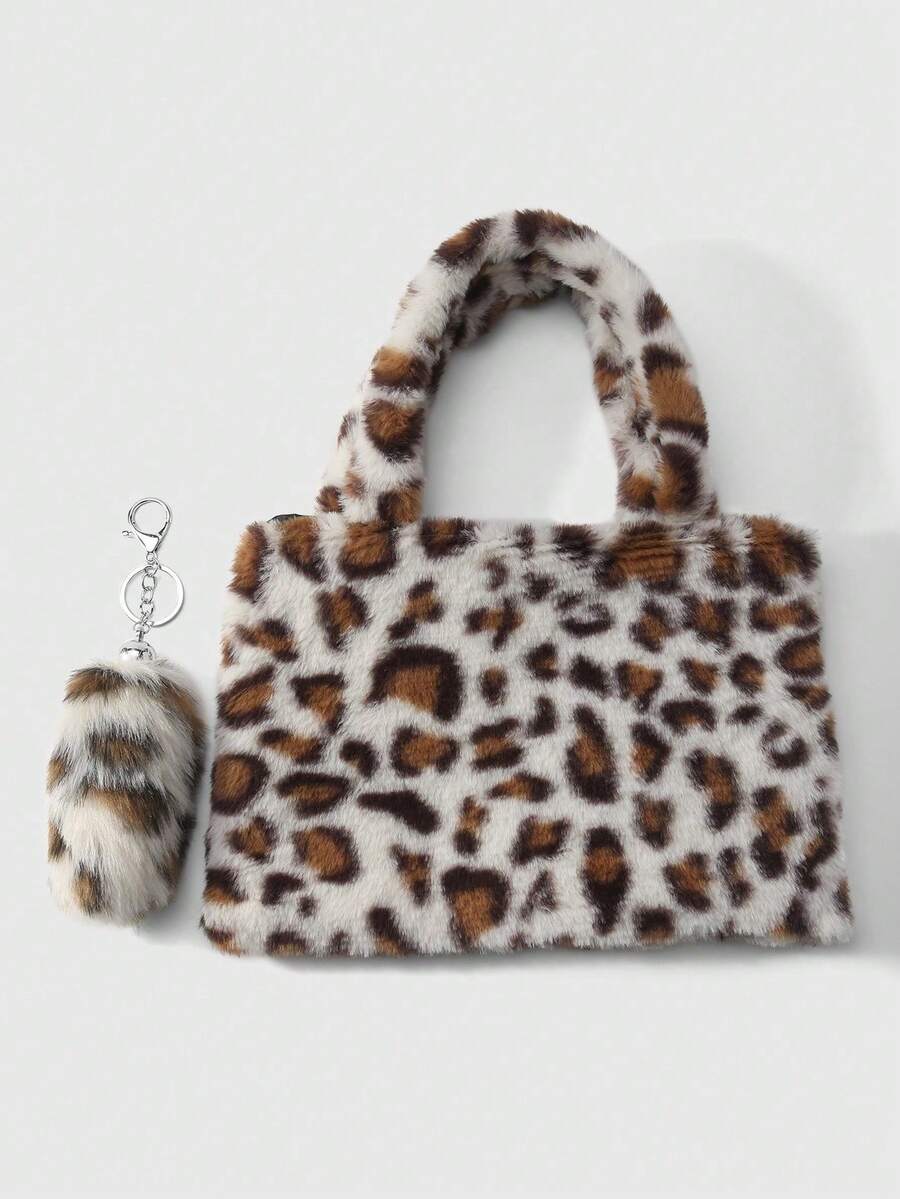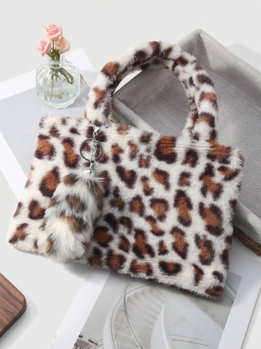 Goth Set de 2 piezas que incluye: 1) Bolso minimalista, casual y versátil con estilo retro y universitario, con estampado de leopardo o tigre de piel de conejo sintética, adecuado para uso diario y como regalo. 2) Llavero con cola de leopardo sintética esponjosa y mini animal, accesorio para bolso