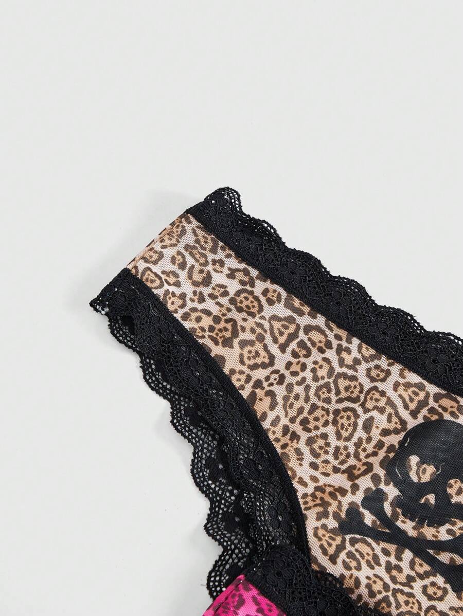 Goth Set de 4 piezas de bragas de mujer con estampado de leopardo, calavera y encaje de red