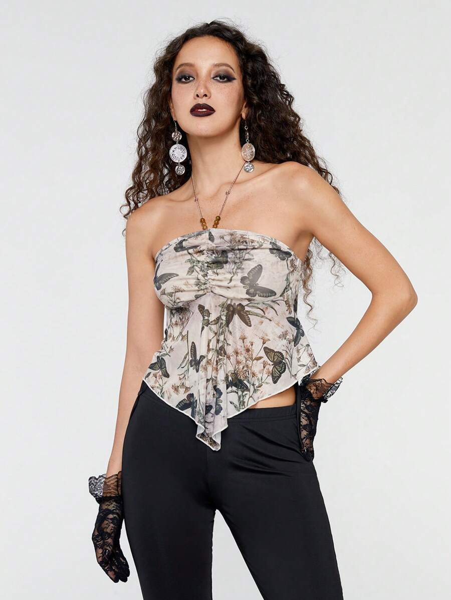 ROMWE Avant Top halter con estampado floral con mariposa fruncido