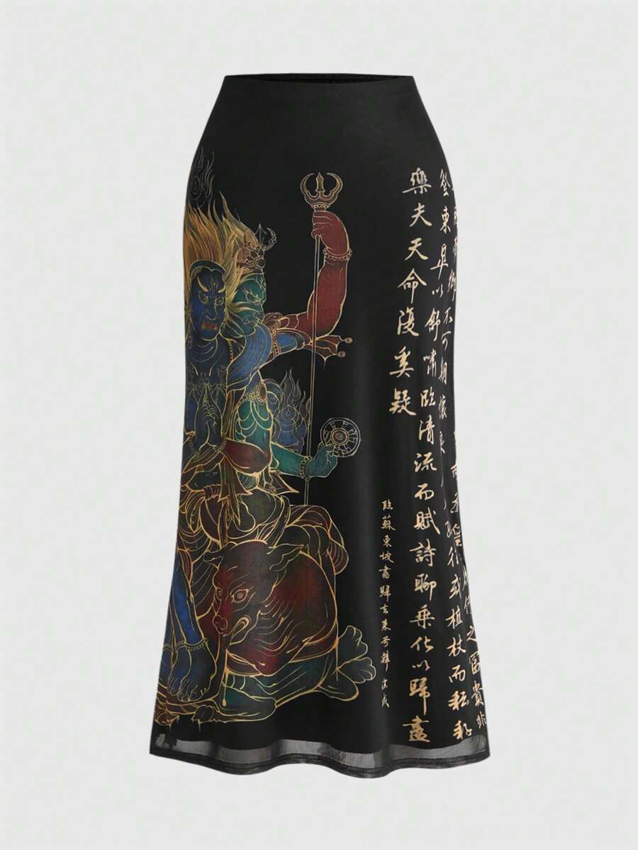 Goth Falda de mujer con estampado de texto de sutra de rueda del dharma y tocado de llama deífica de estilo chino