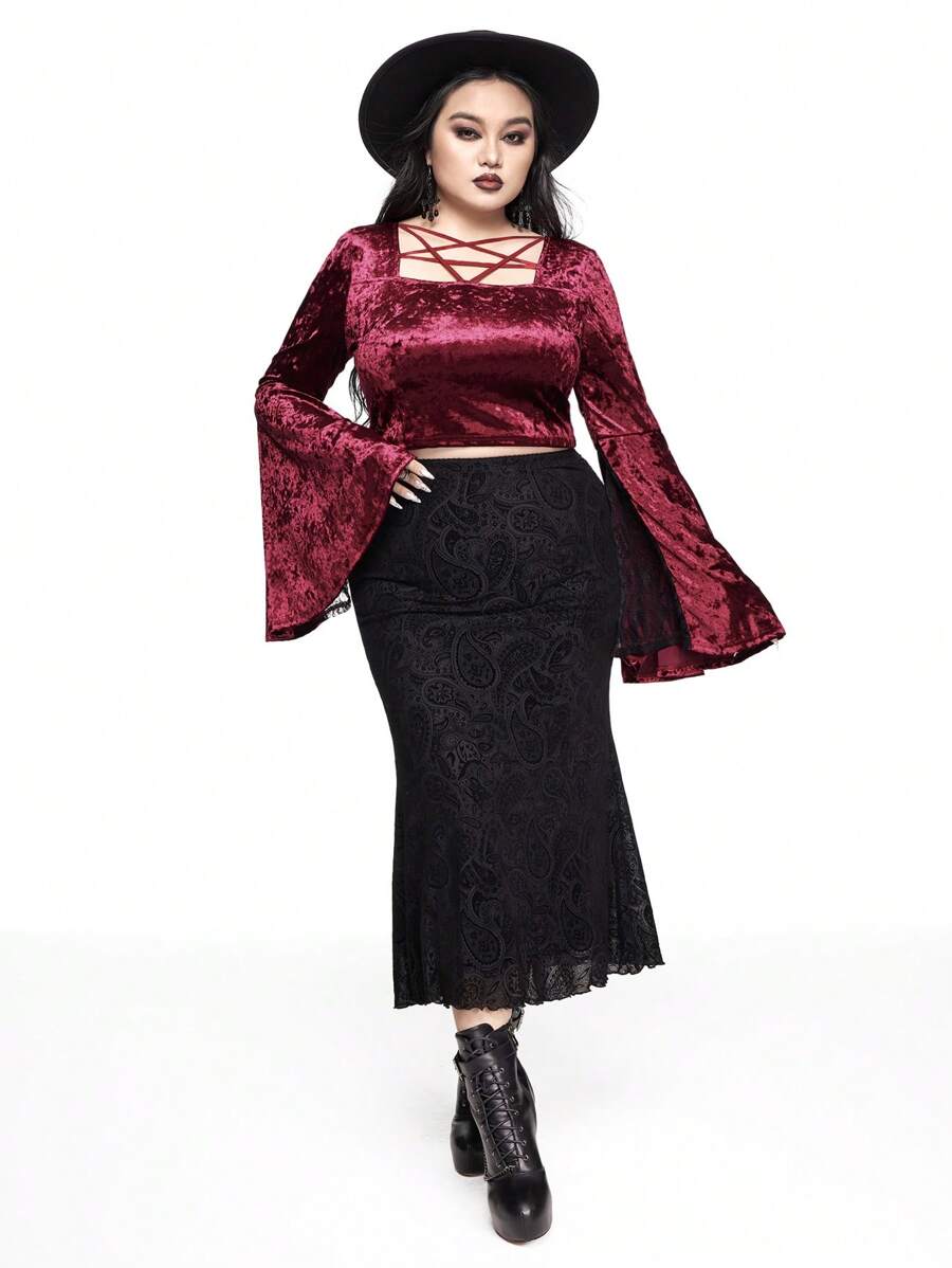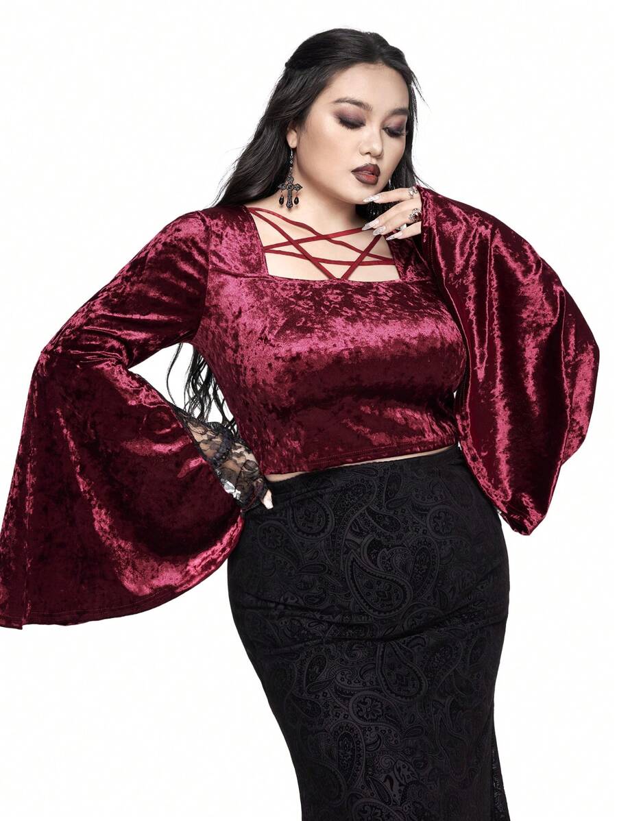 Goth Blusa navideña talla grande para mujer con cuello cuadrado gótico, cuello de estrella, mangas de campana y aplicaciones de encaje