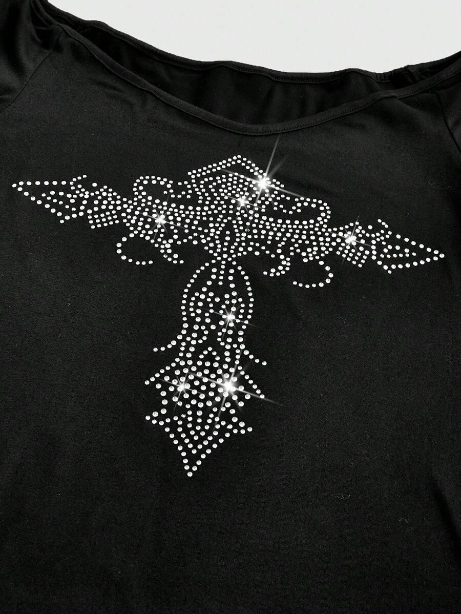 Goth Camiseta de manga corta con un hombro descubierto y decoración de cristales en forma de cruz, para carnaval