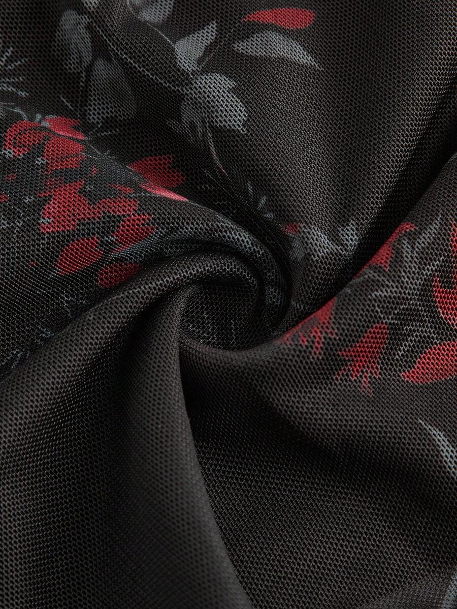 Goth Blusa ajustada de malla de cuello cuadrado con estampado floral y mangas campana, de estilo gótico oscuro, para mujeres