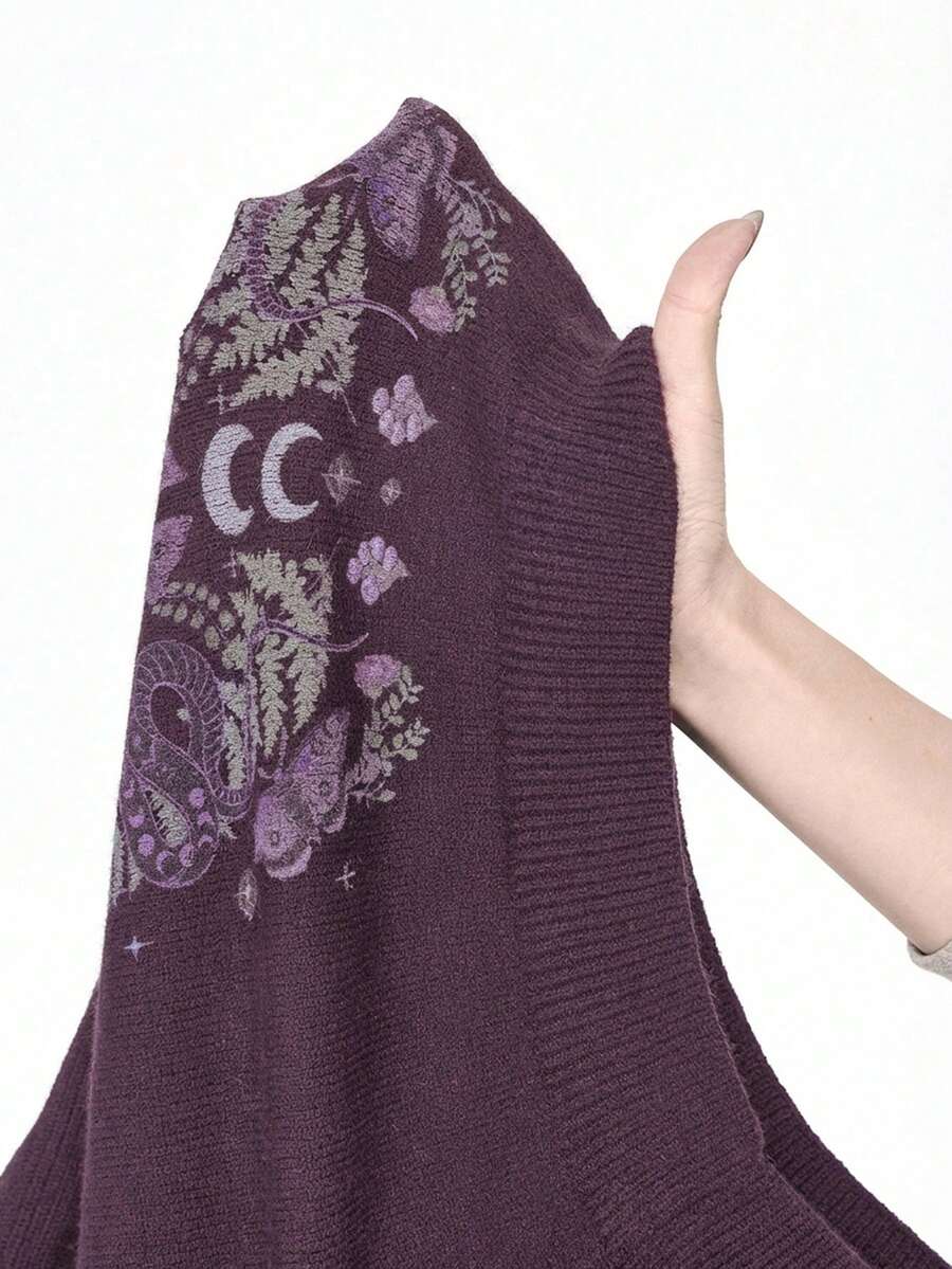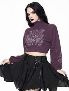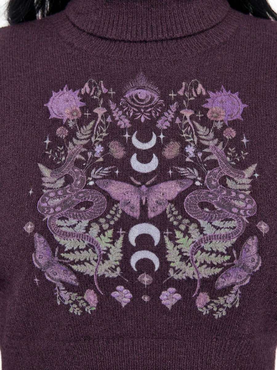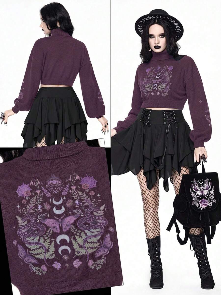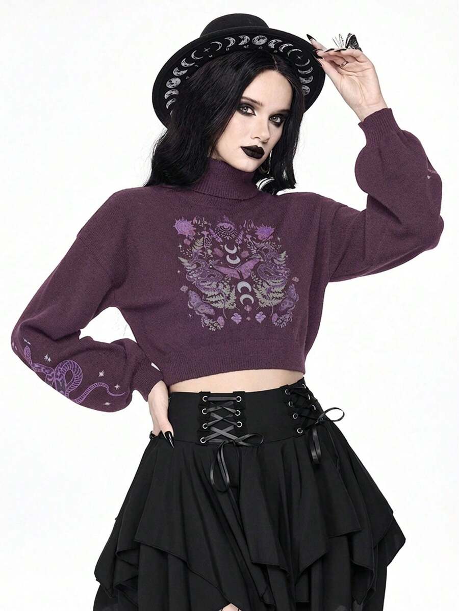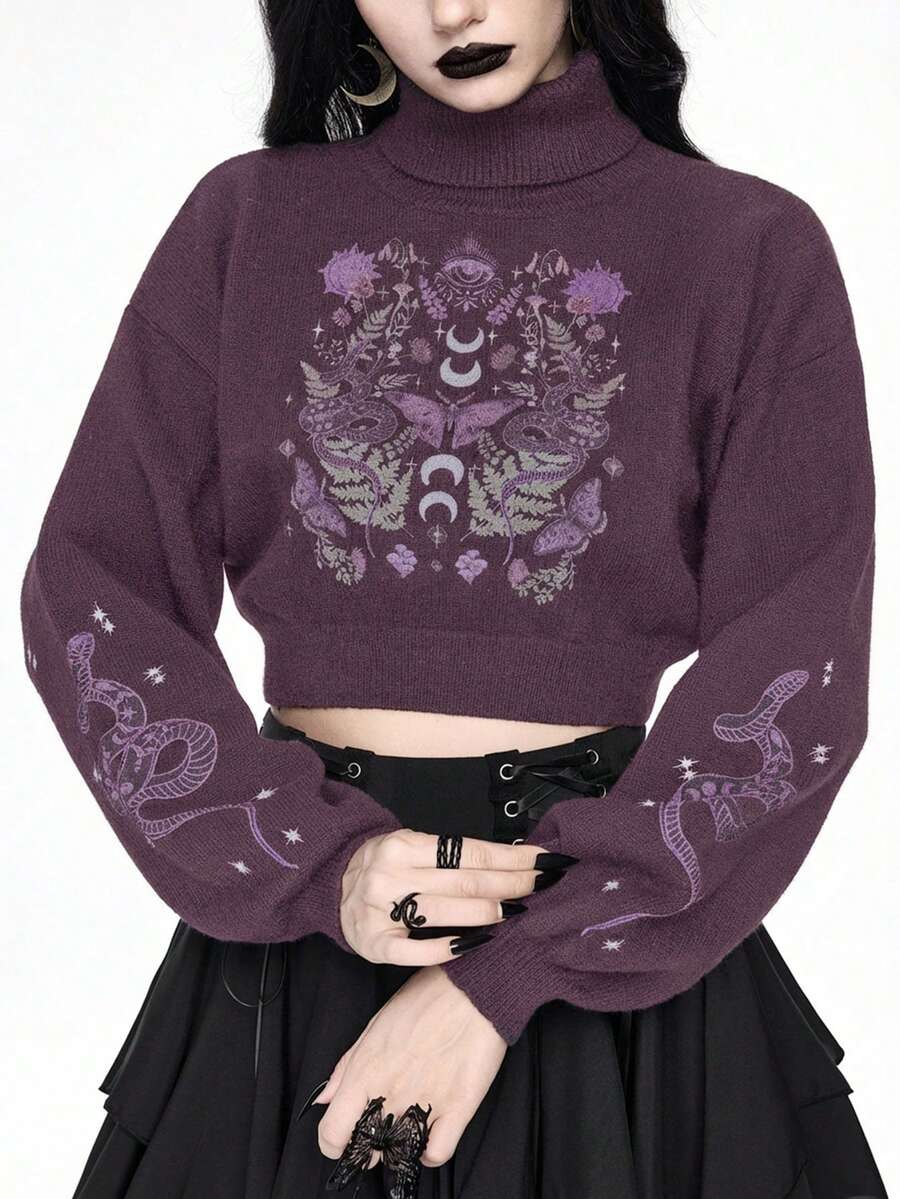 Goth Suéter corto de cuello alto en color oscuro para mujer, blusa de punto con mangas abullonadas y estampado jacquard de piel de serpiente y mariposa vintage, otoño/invierno