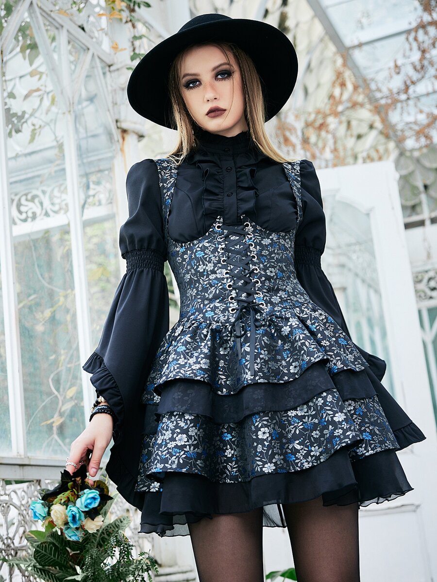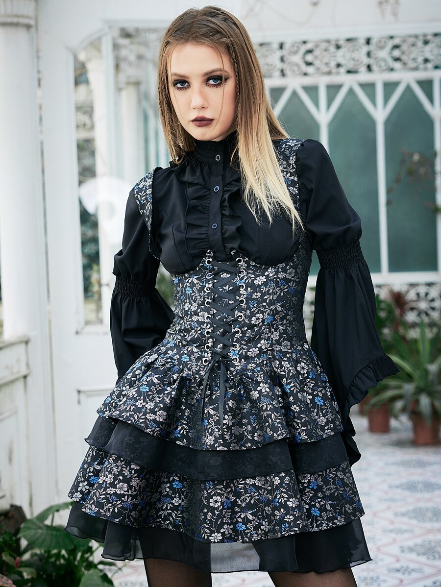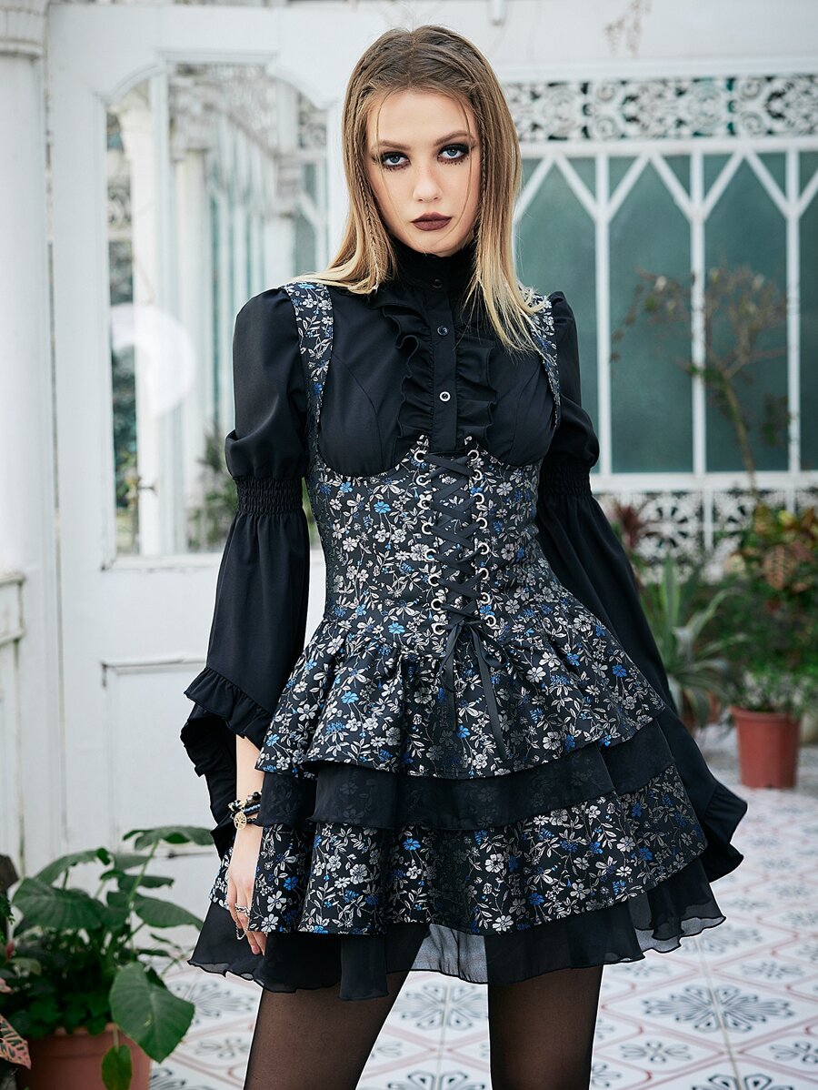 Goth Vestido de tirantes con estampado floral bajo a capas