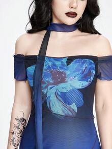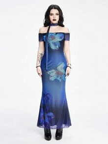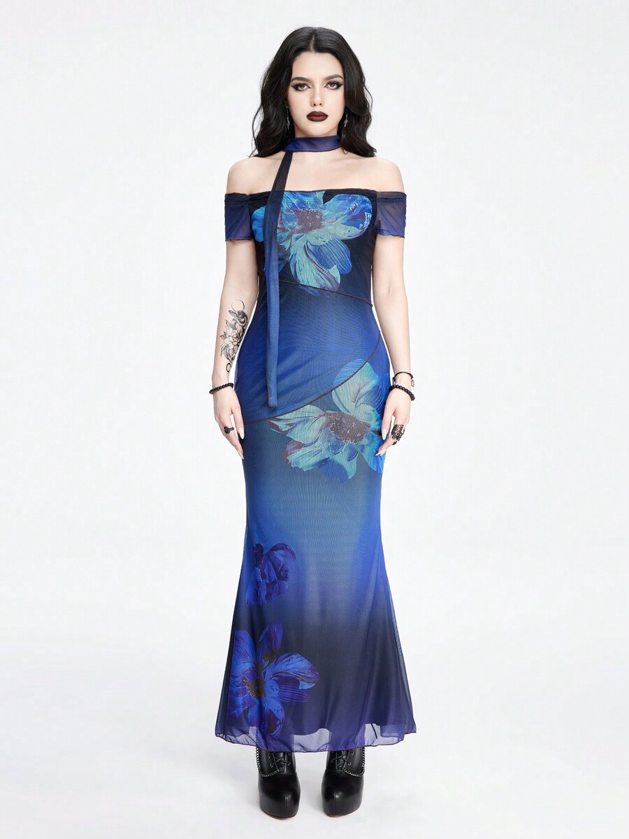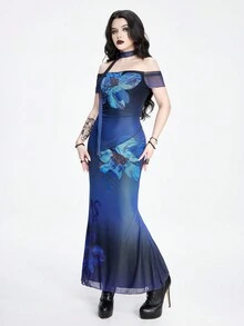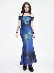 Goth Vestido de mujer madura elegante y sexy con estampado floral y malla, con pañuelo sin hombros