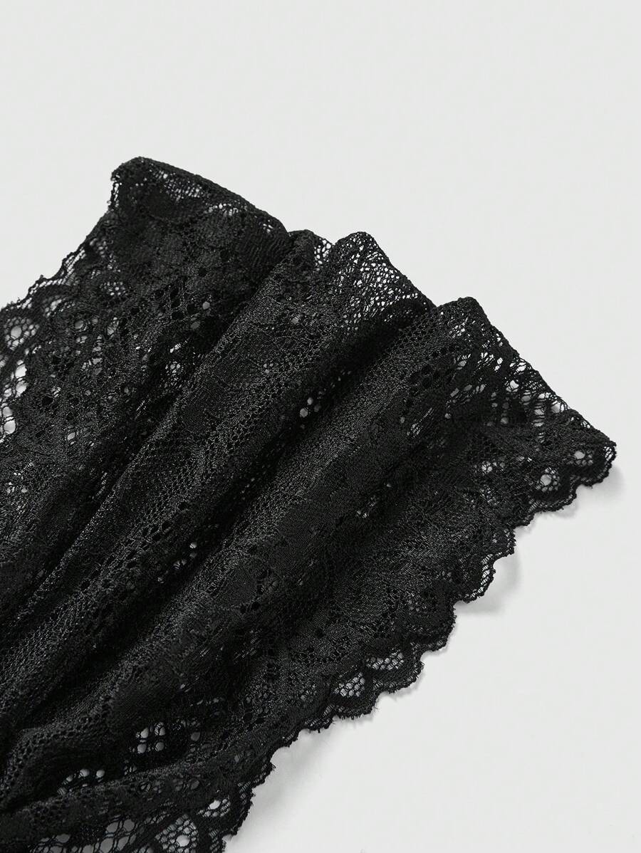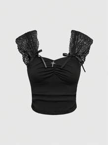 Goth Elegante camiseta para mujer de unicolor con lazo de encaje y cinturón fruncido en el pecho y colgante de lazo tejido elástico de ajuste entallado