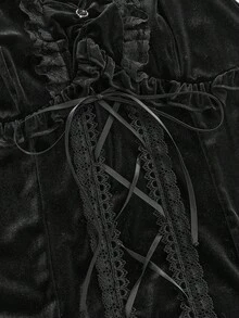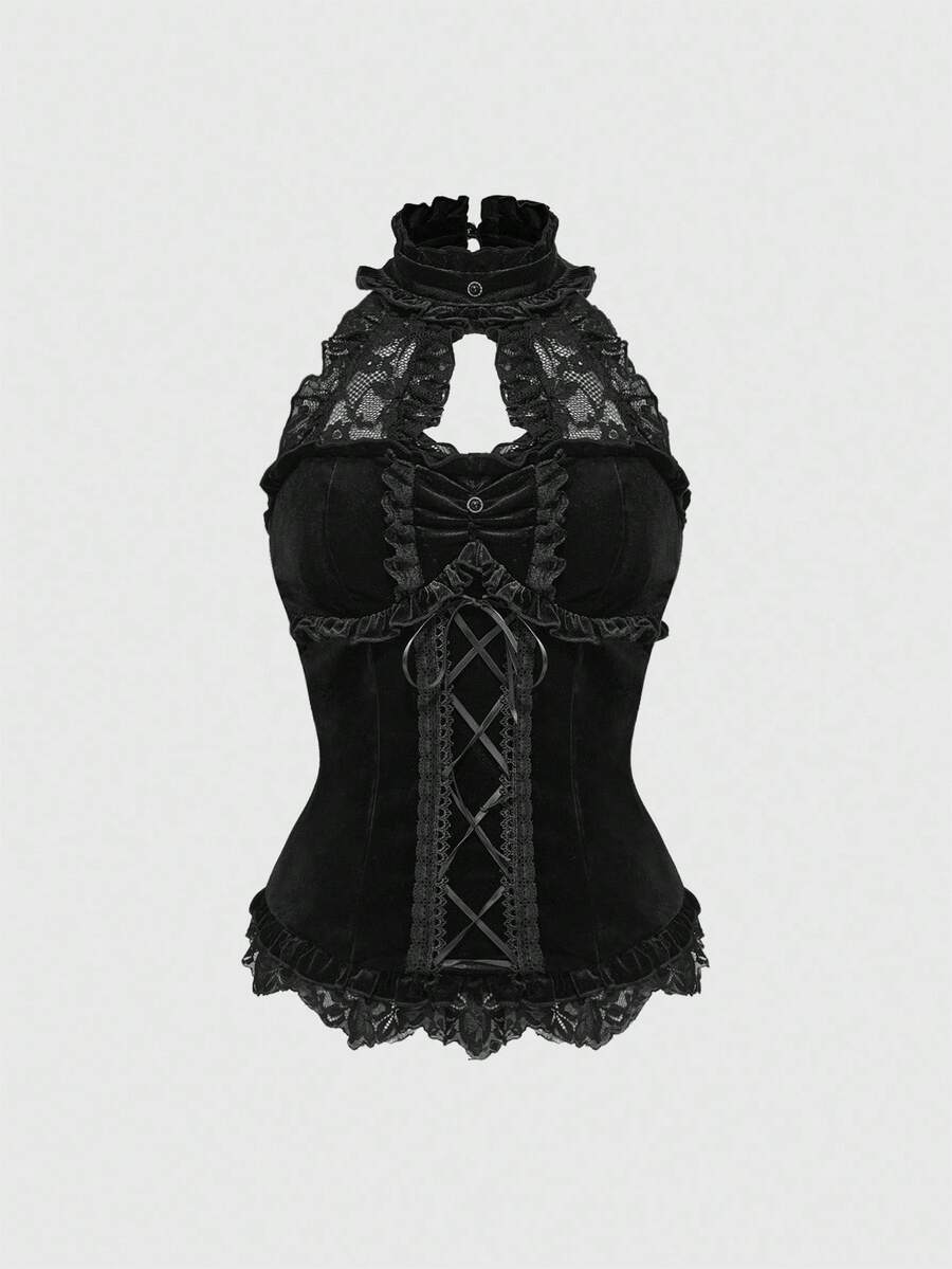 Fairycore Camiseta de mujer con cuello alto de terciopelo y encaje, con parches y lazo en la cintura, de estilo gótico elegante