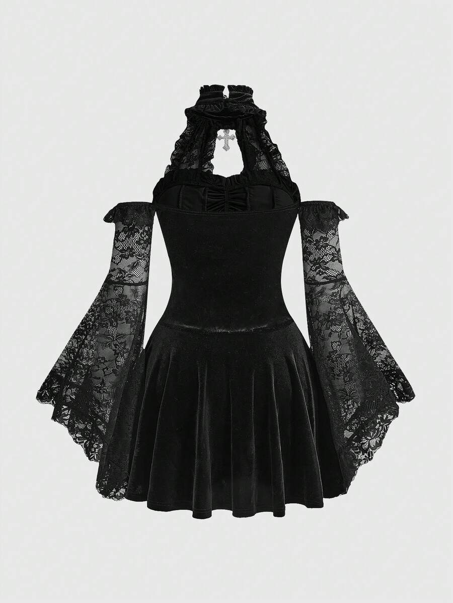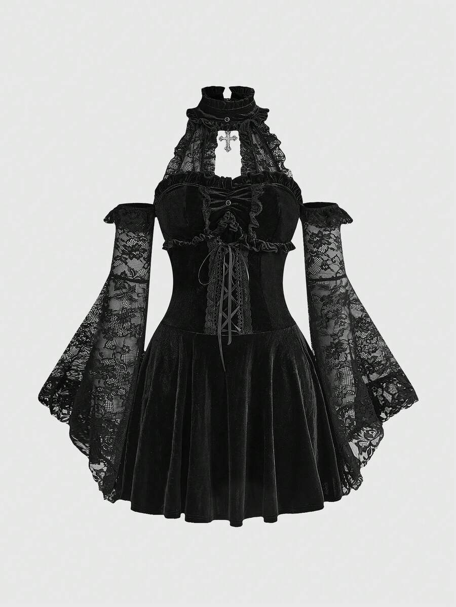 Goth Vestido mini con cuello alto, de terciopelo y encaje en patchwork, con cintura anudada y mangas acampanadas, de estilo gótico elegante
