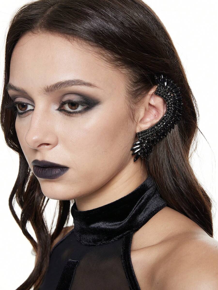 Goth Pendiente de clip con hoja llena de cristales exagerada de moda, para usar de un solo lado