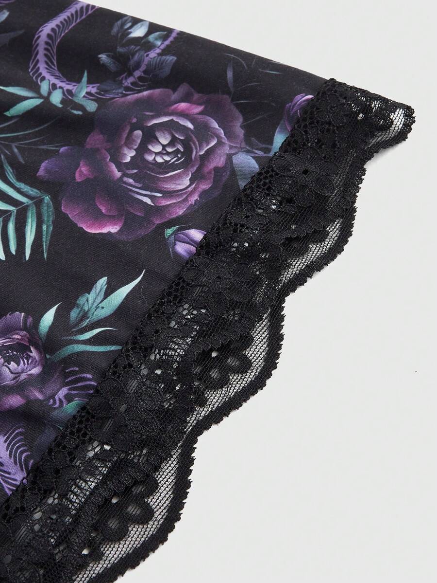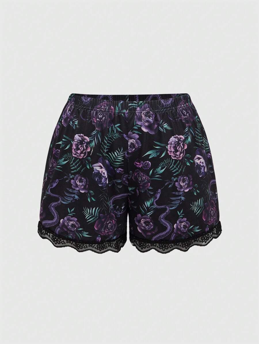 Goth Conjunto de ropa de hogar para verano de talla grande con blusa sin mangas y short de encaje con estampado de hueso de serpiente y flores
