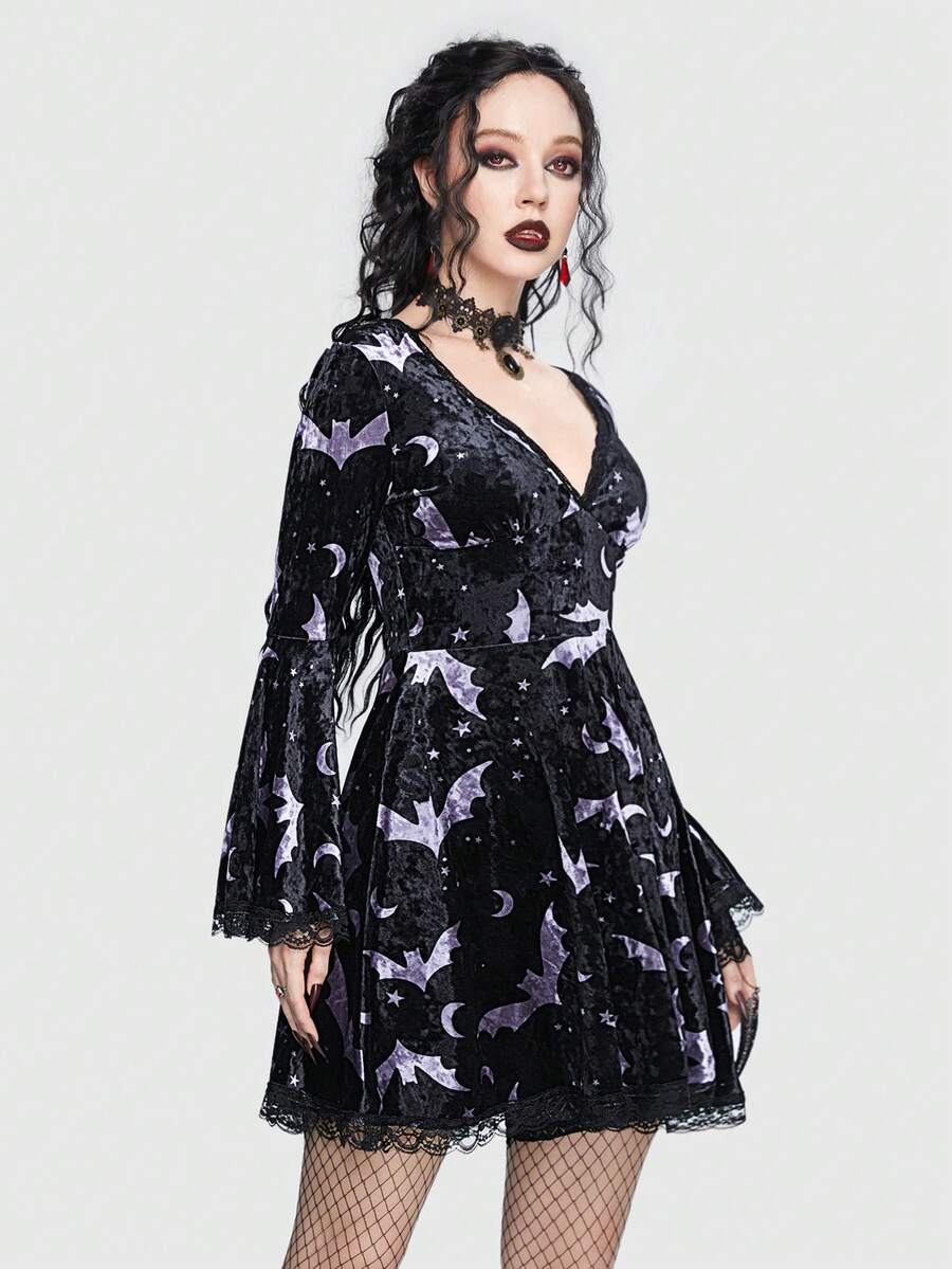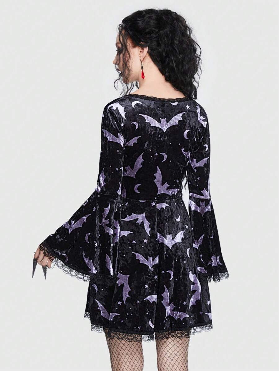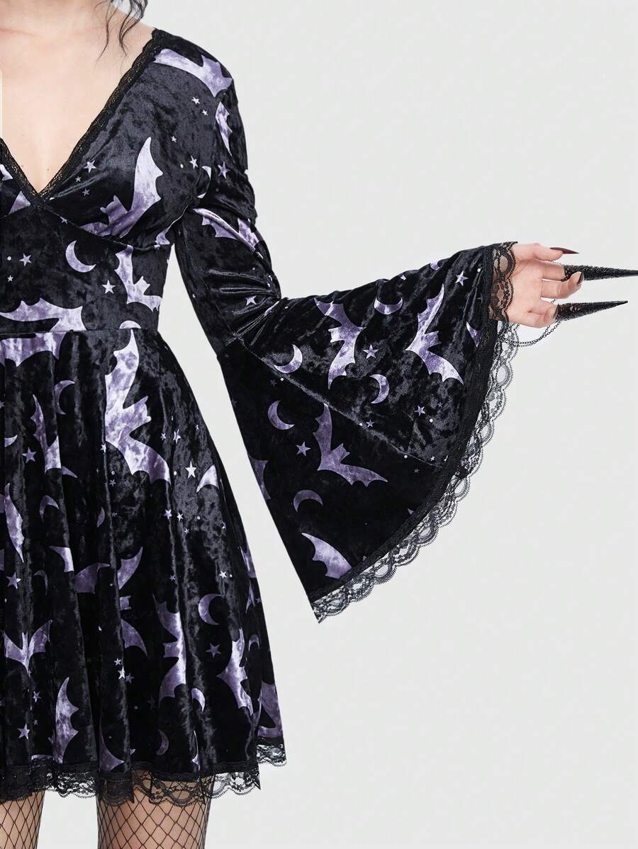 Goth Vestido con estampado de galaxia con encaje en contraste de manga amplia de terciopelo
