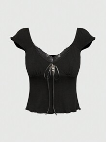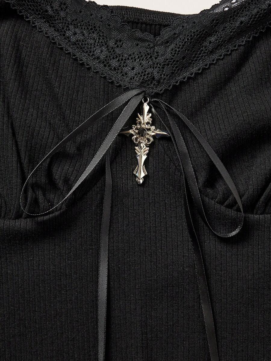 Goth Camiseta ajustada corta de encaje contrastado para mujer con collar con colgante de cruz gótica y decoraciones de metal