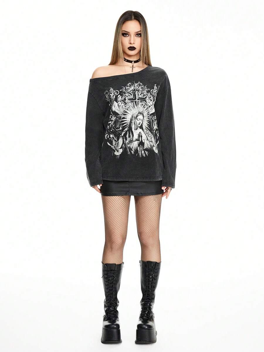 Goth Camiseta asimétrica extra grande para mujer con estampado de cruz gótica y Virgen María desgastada