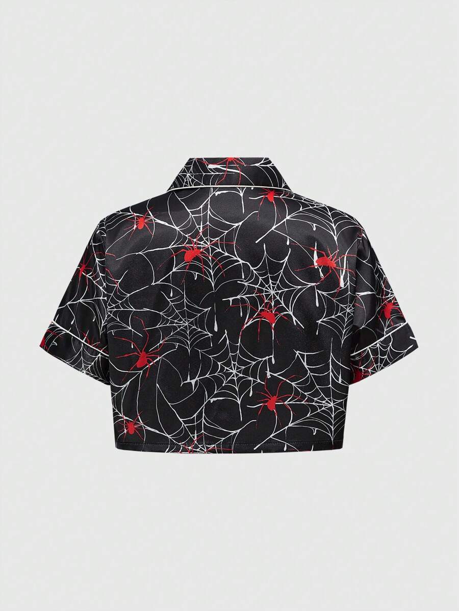 Goth Conjunto de pijama casual con pantalón corto de satén con estampado de telaraña gótico oscuro