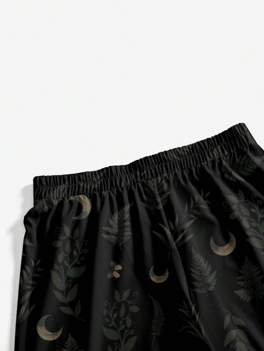 Goth Pantalones holgados de estilo bohemio de talla grande para mujeres, en color negro, con estampado de luna misteriosa y hojas de plantas en estilo gótico