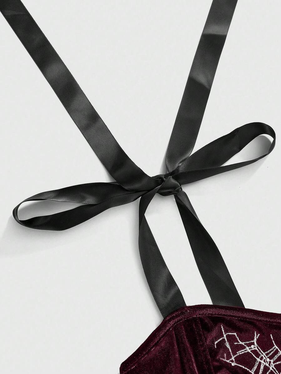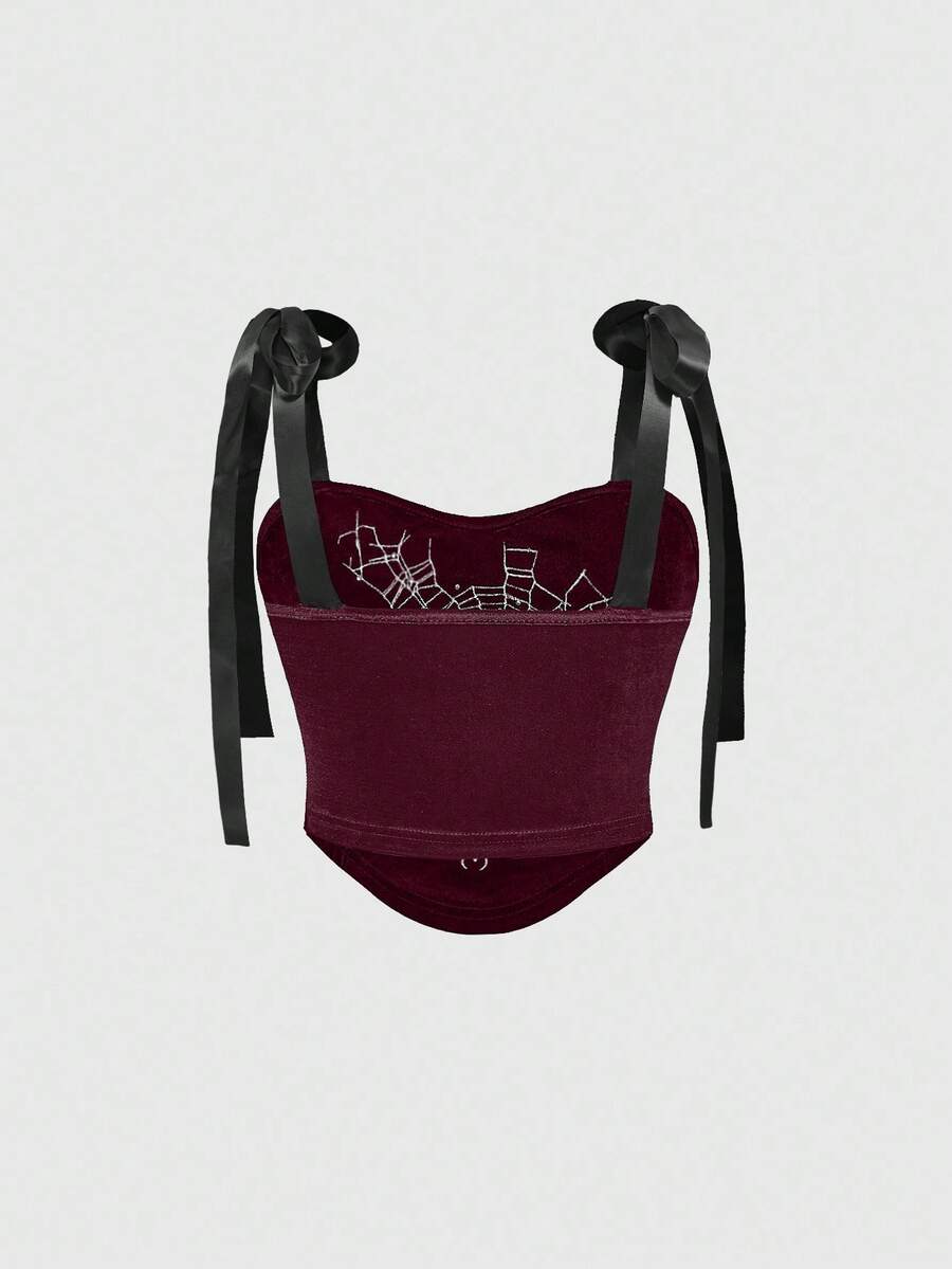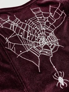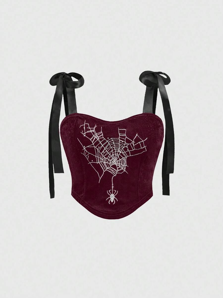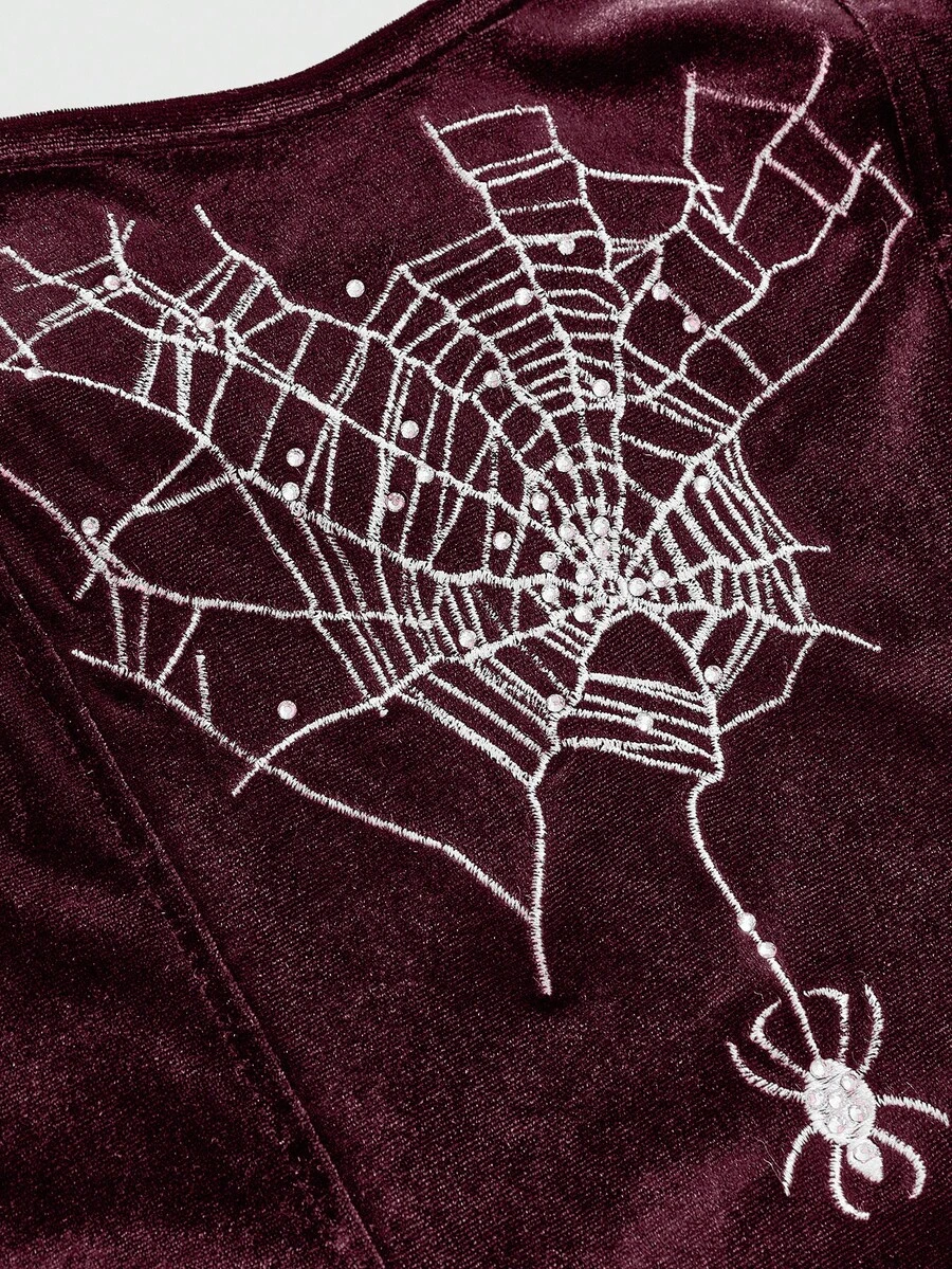 Goth Parte superior de encaje con cuello cuadrado, bordado de araña y rhinestones, estilo gótico palaciego para mujer