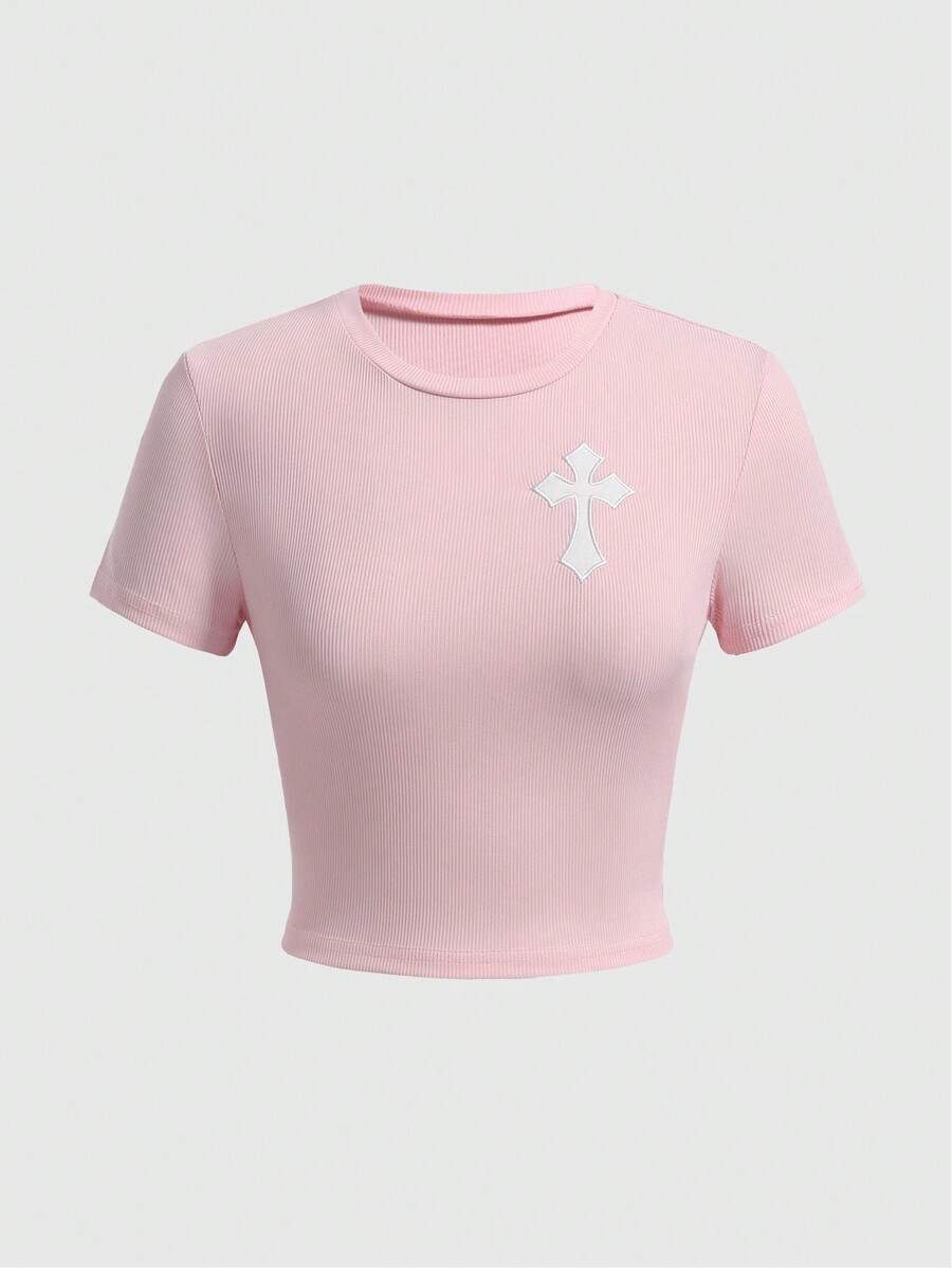 Goth Camiseta ajustada rosada para mujer con bordado de cruz estilo gótico punk