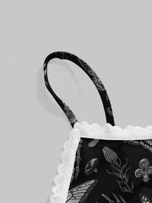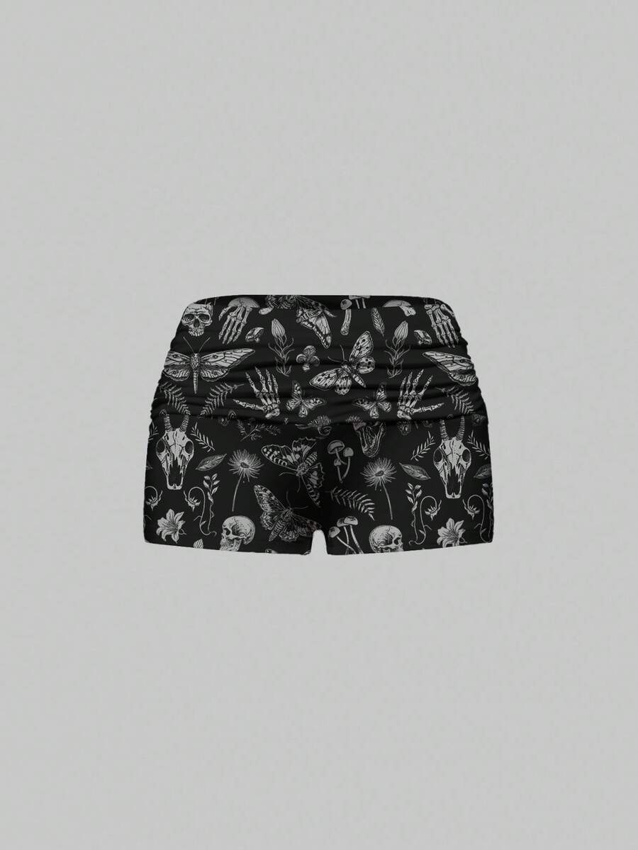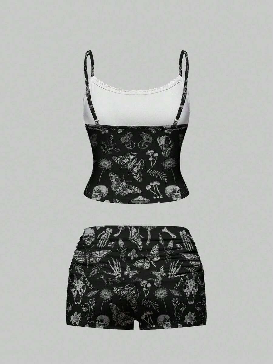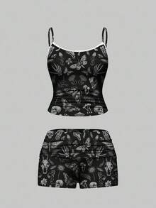 Goth Conjunto de pijama con camiseta de encaje con estampado de calavera gótica, mariposa, polilla, seta y planta, y pantalones cortos fruncidos, ropa de estar en casa informal