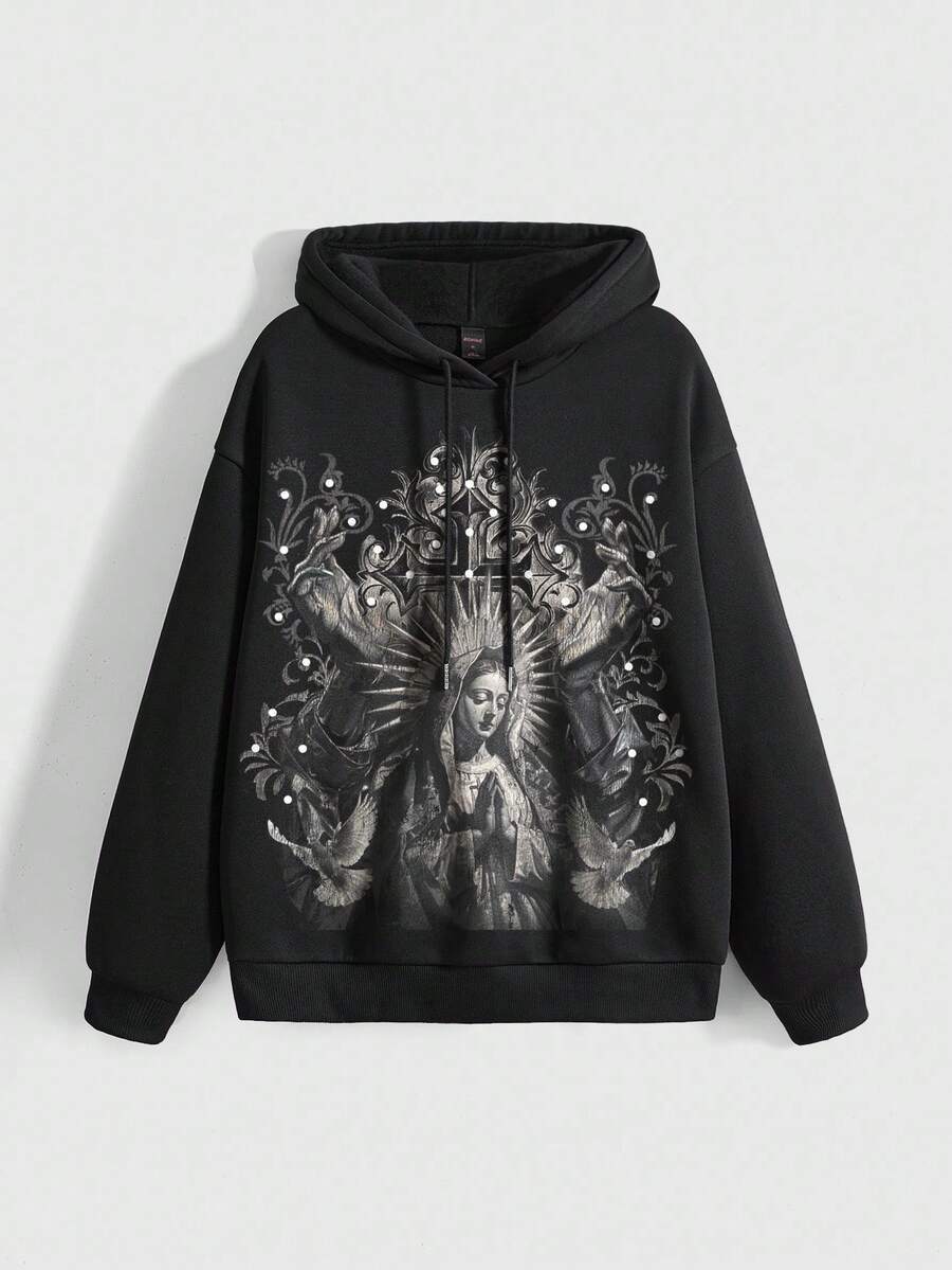 Goth Sudadera con capucha negra suelta con gráfico de calle, Virgen María gótica, misteriosa y con enredaderas