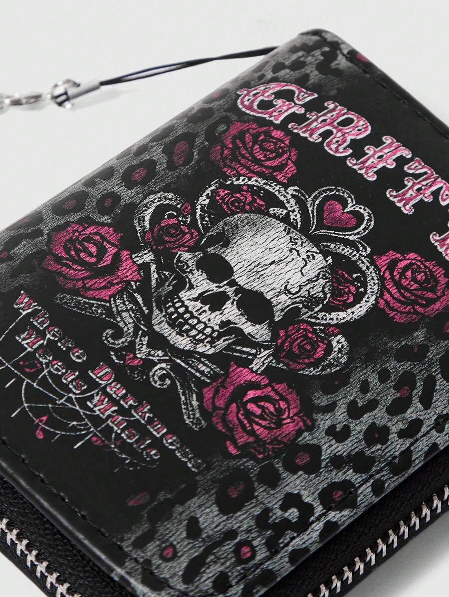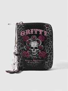 Goth Billetera corta con colgante de calavera de rosa gris con mariposa y borde estampado de leopardo, cartera creativa multifuncional portacartas