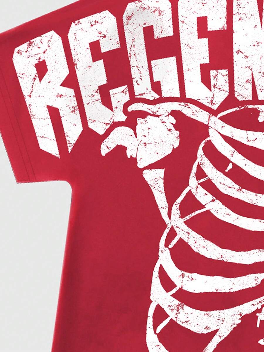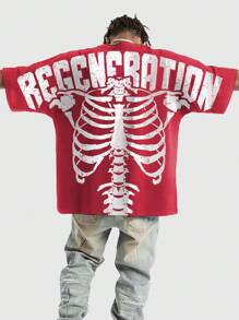 Goth Camiseta de manga corta casual para hombre con bloqueo de color, estampado de esqueleto y letra
