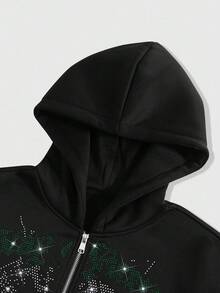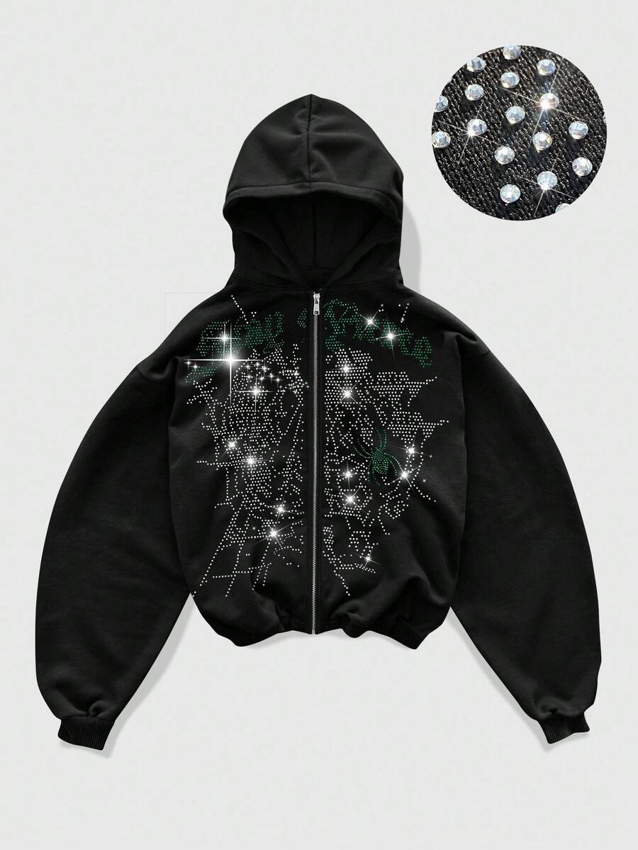 Goth Sudadera con capucha casual de hombre con cremallera, cuello con rhinestones y estampado de letras, para otoño