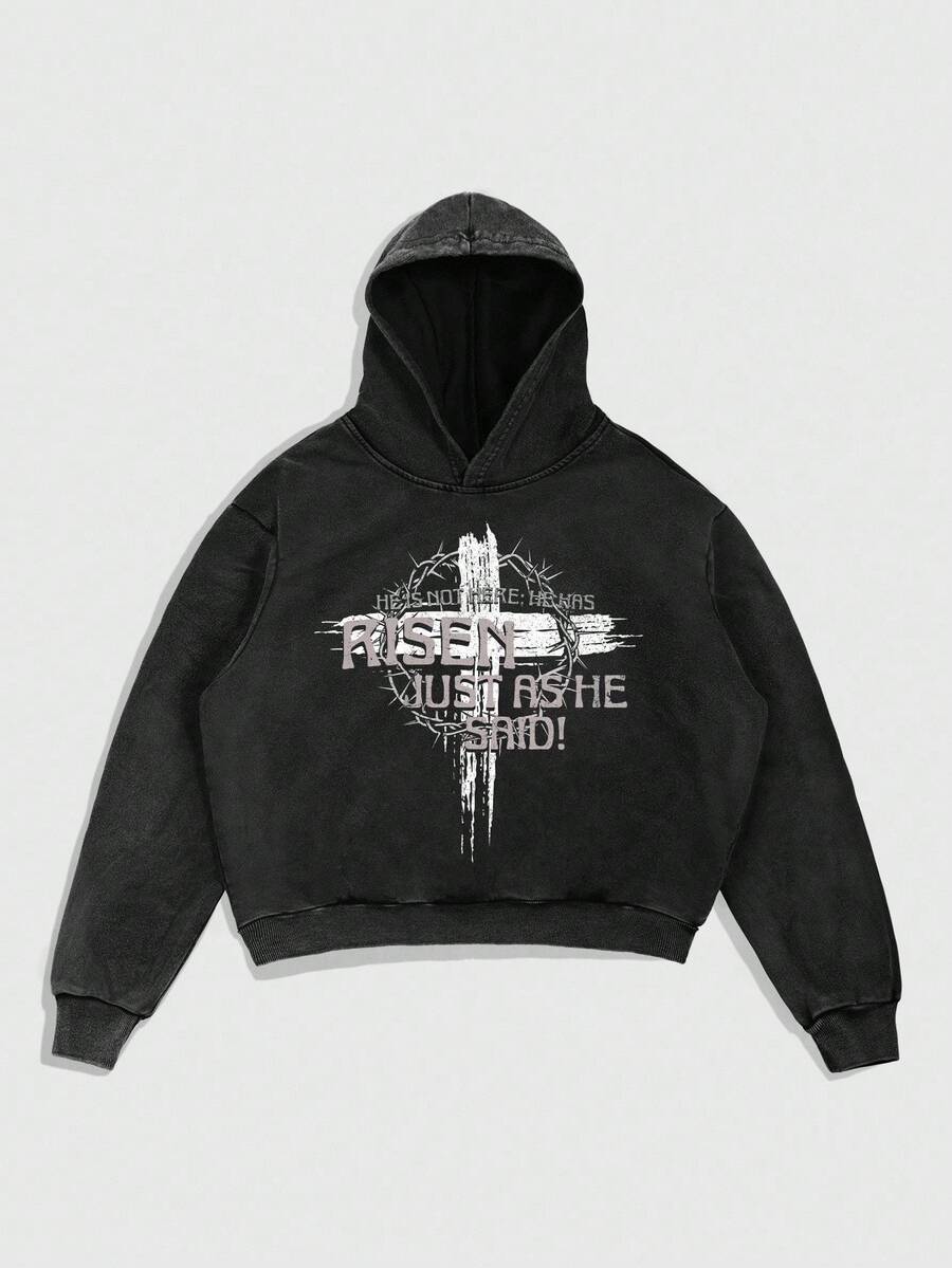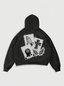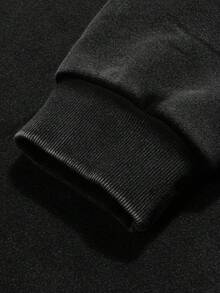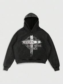 Goth Sudadera con capucha de manga larga de forro térmico casual con estampado de eslogan y cruz para hombre, color negro, para otoño