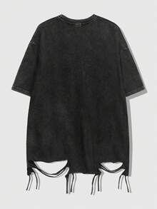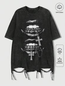 Goth Camiseta suelta de verano para hombre con estampado de labios mordidos y cruces de rhinestone, estilo casual y urbano