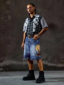 Goth Pantalones cortos vaqueros casuales de hombre con estampado de Virgen María y adornos de rhinestone, para verano