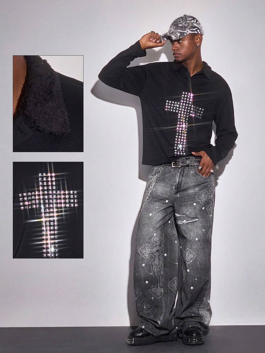 Goth Camisa polo casual de manga larga con patrón de cruz para hombre