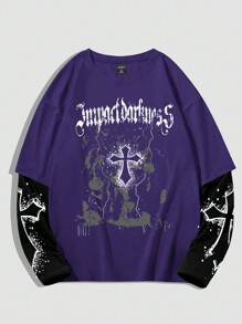 Goth Camiseta de manga larga de cuello redondo casual y versátil con estampado de letras y cruz para hombre