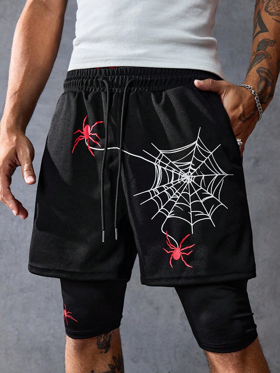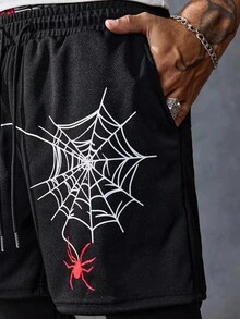 Goth Pantalones cortos con estampado de araña, cintura con cordón y bolsillos, de doble capa, para Halloween