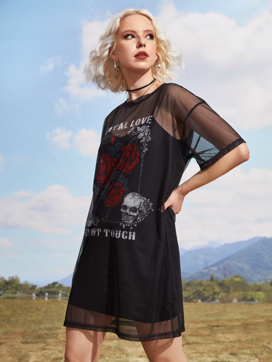 Goth de malla Vestido & rosa con estampado de cráneo Vestido de tirantes