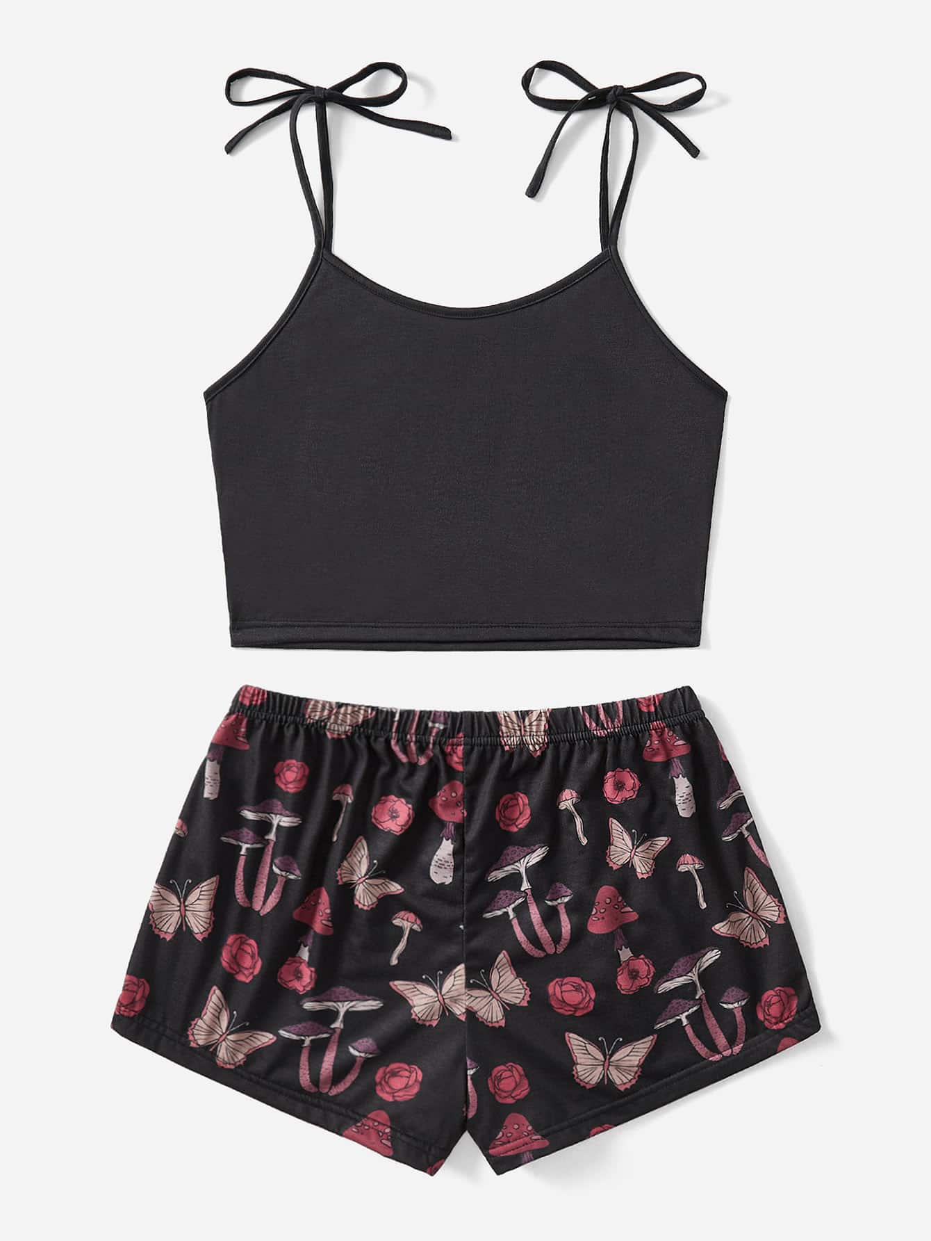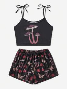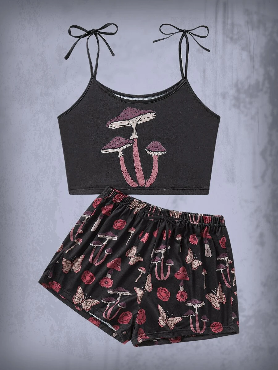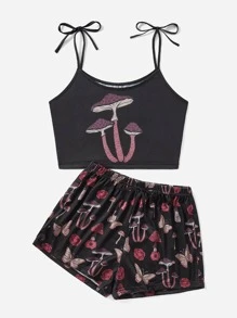 Goth Conjunto de pijama con estampado de seta de hombros con cordón
