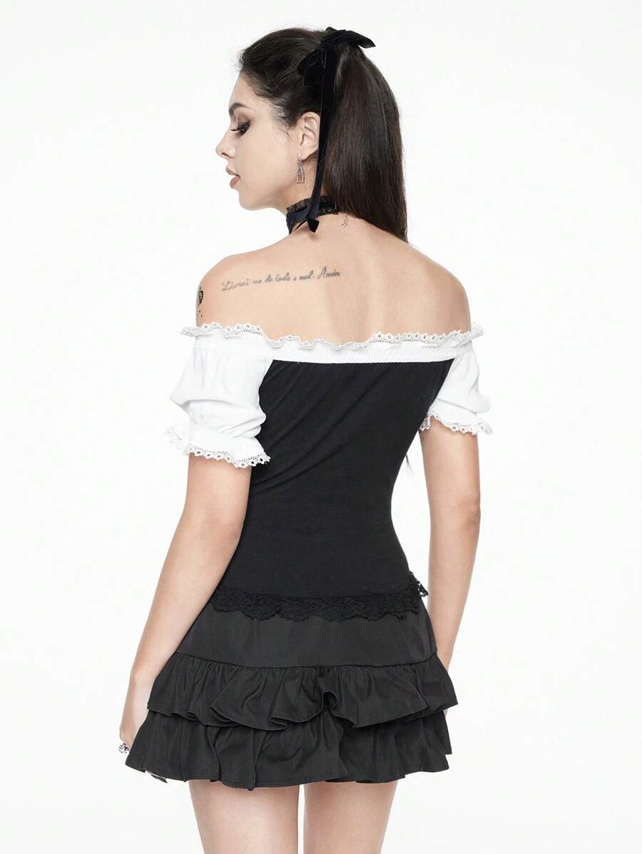 Goth Top de manga abullonada de hombros descubiertos con efecto de múltiples capas y aplicación de encaje