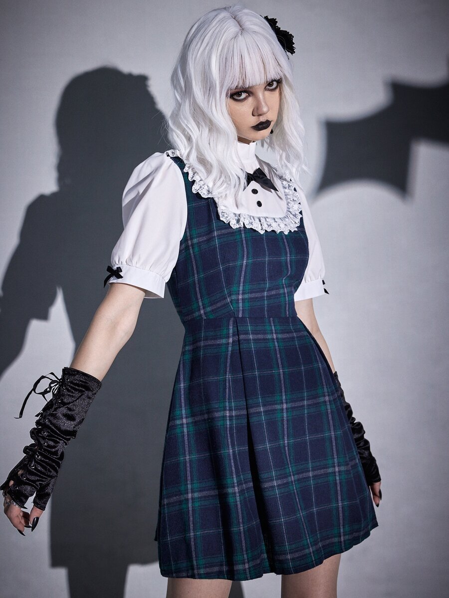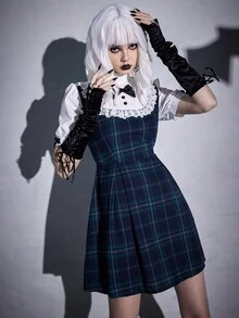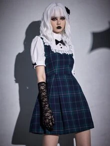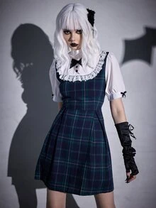 Goth Vestido con estampado de cuadros con lazo delantero ribete con encaje