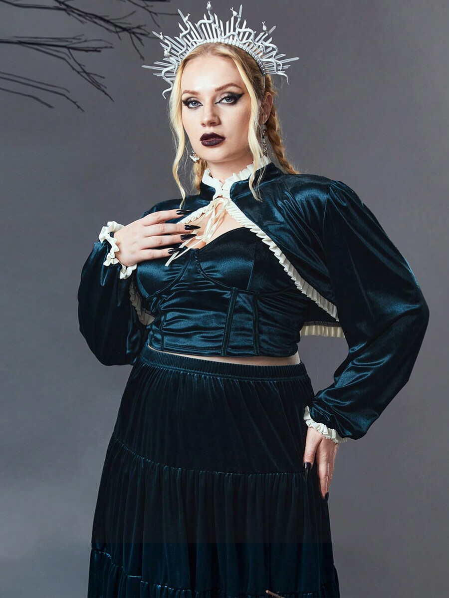 Goth Talla grande Top súper crop ribete fruncido de cuello con cordón de manga farol