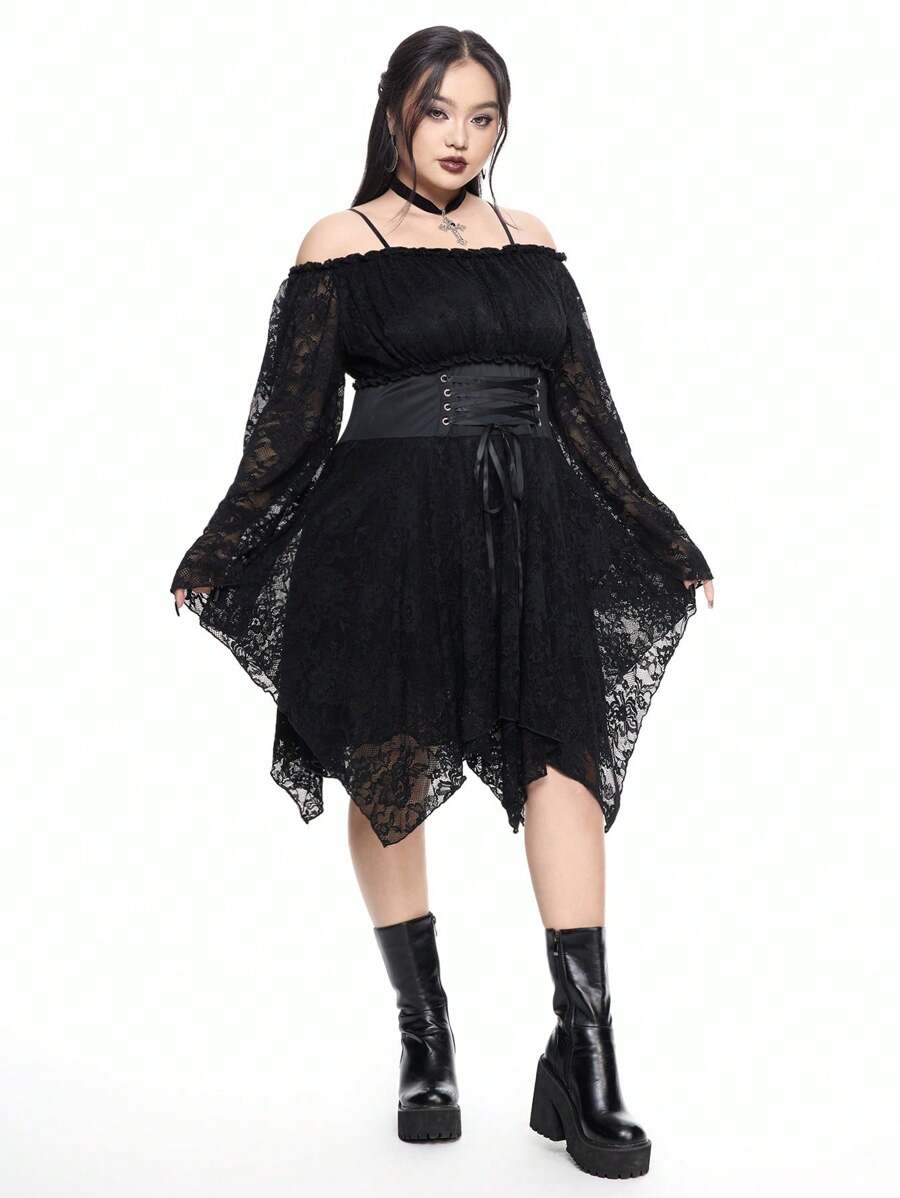 Goth Vestido midi de encaje asimétrico con hombros descubiertos, decoración de lazo en la cintura y talla grande para look gótico elegante
