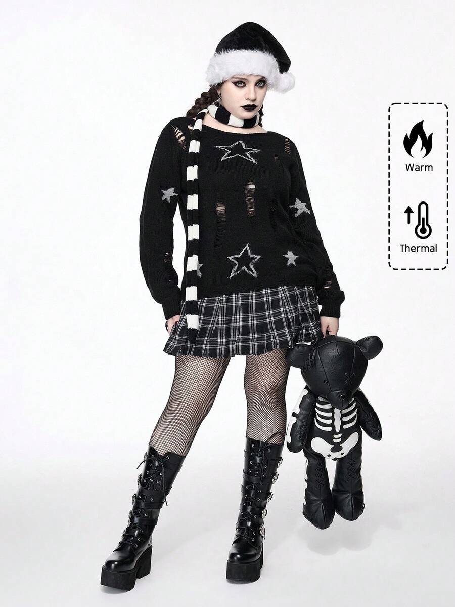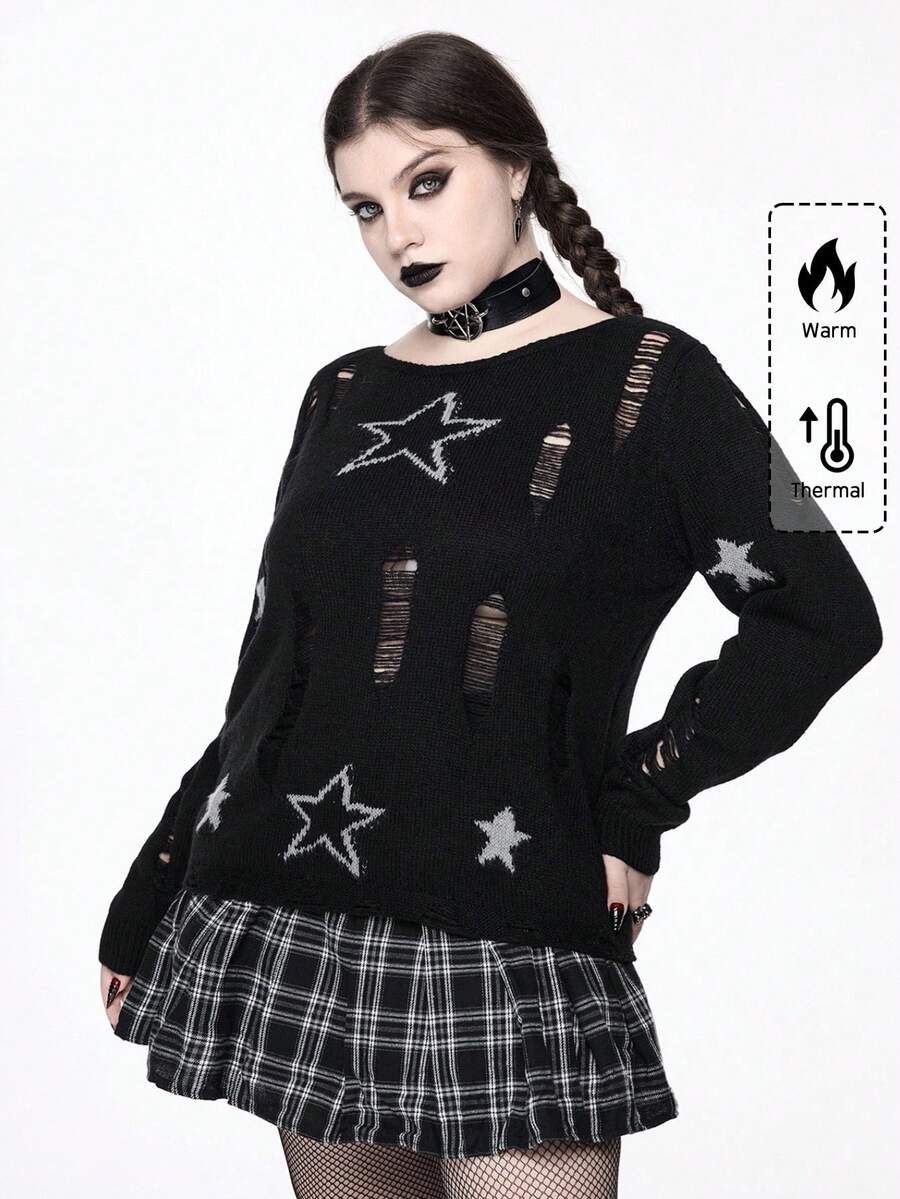 Goth Suéter de punto de manga larga con patrón de estrella desgastado estilo gótico Y2K de talla grande, suéter de punto casual de calle de otoño/invierno de talla grande desgastado para mujer, suéter de punto negro casual diario de talla grande estilo gótico, suéter de punto de talla grande, suéter de punto casual de fiesta navideña de talla grande para mujer