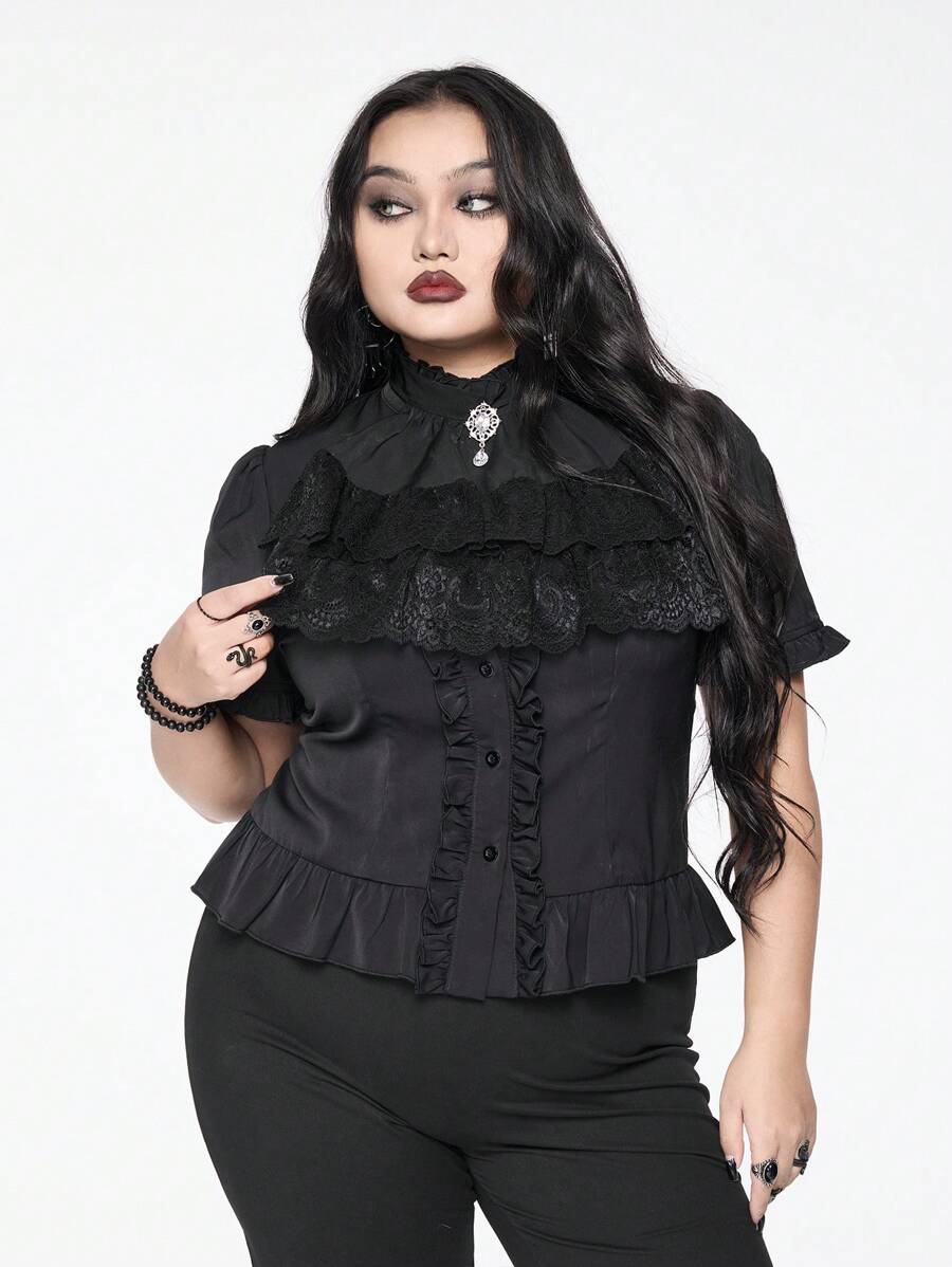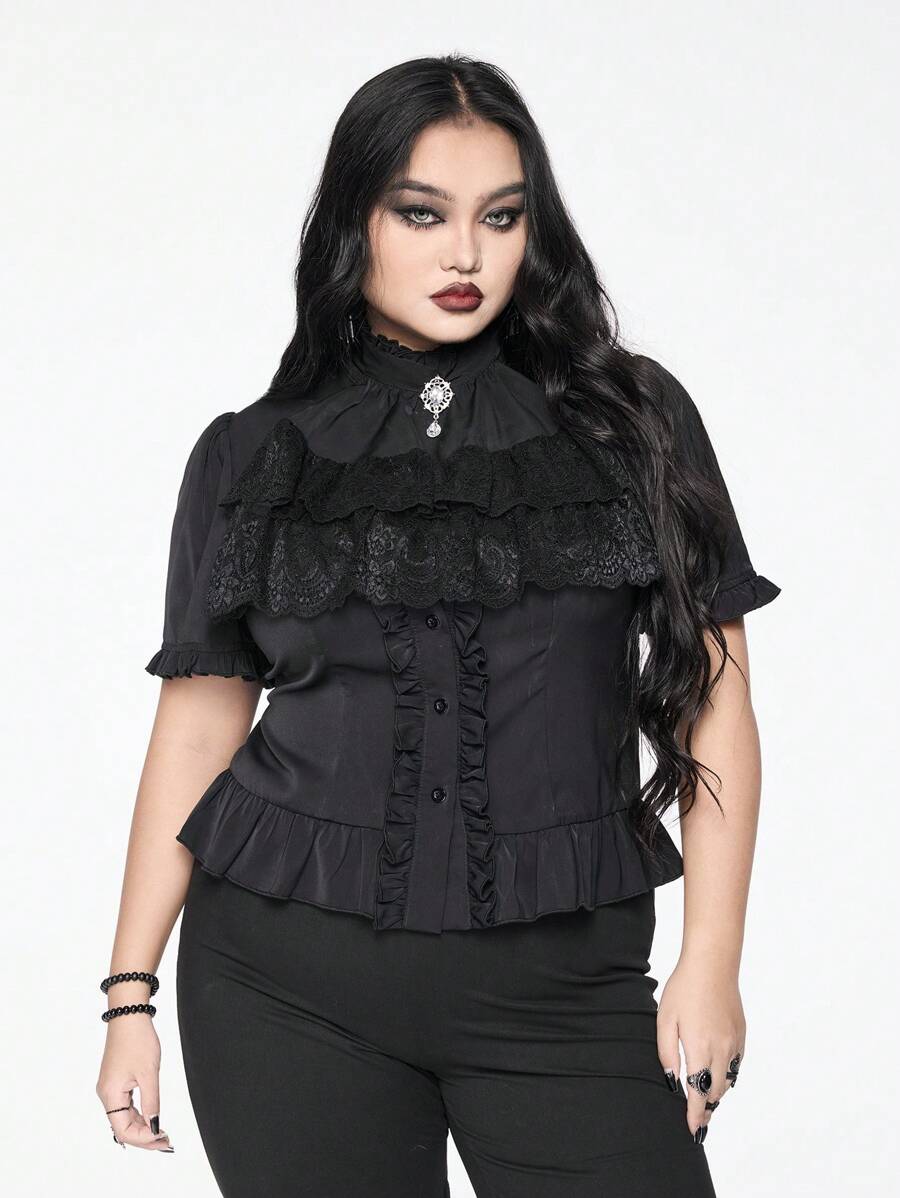 Goth Blusa de estilo gótico vintage y estilo palaciego para mujer talla grande con cuello desmontable con volantes y lazada, colgante de gemas de estilo barroco, mangas de volantes y cintura ceñida